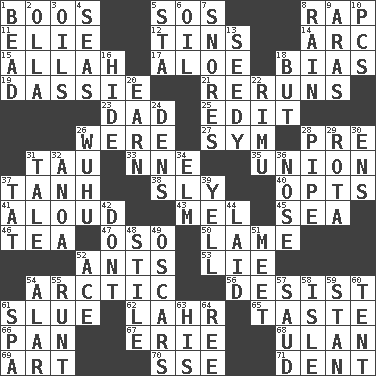 ACROSS 1. Scornful sounds 5. Mayday 8. Hit sharply and swiftly 11. Writer Wiesel 12. Canisters 14. Curve 15. Assad's deity 17. Medicinal plant 18. Prejudice 19. Hyrax 21. Summer TV shows 23. Male parent 25. Prepare for publication 26. Past tense of be (plural) 27. Symbol (abbr.) 28. Before (prefix) 31. The 19th letter of the Greek alphabet 33. Compass dir. 35. The state of being joined or united 37. Hyperbolic tangent 38. Playfully artful 40. Chooses 41. Verbally 43. Cartoonist voice _ Blanc 45. Ocean 46. Afternoon social gathering 47. Bear (Spanish) 50. Unable to walk 52. Pismires 53. Whopper 54. Northern region 56. Stop 61. Turn sharply 62. Cowardly lion portrayer 65. Clothes sense 66. Baking dish 67. 4th largest of the Great Lakes 68. ____ Bator 69. Tate display 70. Compass dir. 71. Incision DOWN 1. Necklace unit 2. Rounded earthenware pot or jar 3. Petroleums 4. Oceans 5. R.R. building 6. Lubricate 7. Sounds asleep 8. Water falling in drops from the sky 9. Ancient river in northeast Turkey 10. Personal Computers (abbr.) 13. Shabby and untidy 16. Flintstone garb 18. With the exception that 20. Merit 22. Tall New Zealand timber tree 24. Hiding places for outlaws 26. Chinese city south-southwest of Nanjing 28. Corncob 29. Roll call or roster of names 30. Followers of ems 31. Falsehood 32. Small Philippine buffalo 34. Shade tree 36. Olfactory organ 37. Make lace 39. Shout 42. Do not 44. Put down 48. Vertical member of a panel or frame 49. Motion picture awards 51. Confront 52. Adept person 54. Having or resembling wings 55. The smallest animal of a litter 57. Saudi Arabian king (1953-1964) 58. Small island 59. Comedian Laurel of Laurel & Hardy 60. Portable shelter 61. Health resort 63. Part of HMS, perhaps 64. To riddle