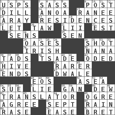 ACROSS 1. United States Postal Service (abbr.) 5. Backtalk 9. Mail 13. Deli pickle 14. Small Philippine buffalo 15. The wife of a rajah (variant) 16. Like ___ of sunshine 17. Homes 19. Allow 20. The 23rd letter of the Hebrew alphabet 21. Cards in a Roman deck? 22. Eastern Standard Time (abbr.) 23. Elected reps. 25. Elected rep. 26. Fertile tracts in a desert 30. Opportunity 34. From or relating to Ireland 35. Grandmother 36. Small boys 39. Sadhe (variant) 42. Wrote a lyric poem 43. Hub of activity 44. Less widely known 46. Extremities 47. A sleeping potion; an opiate (poet.) 48. Greek goddess of the dawn 51. Toward the sea 54. Institute legal proceedings 57. Whopper 58. Separate the seeds from cotton 60. Morning condensation 62. Interpreter 65. Legendary monster 66. Match 67. Back-to-school mo. 68. Precipitation 69. Raze (variant) 70. Relaxation 71. Cy Young winner Saberhagen DOWN 1. Allodial 2. Titles for men of rank and authority 3. Food holder 4. Cunning 5. "Two Mules for Sister ____" 6. Afresh 7. Distress signal 8. Moves on water 9. Baking dish 10. At one time in the past 11. Observes 12. Trial 15. It's straight from the horse's mouth 18. Pass on 20. Russian ruler of old 24. Annoying sounds 27. Be seated 28. Double-curved letter 29. Pottery fragment 30. Sounds asleep 31. Possessed 32. Single 33. Small boy 36. Definite Article 37. The 18th letter of the Arabic alphabet 38. Movie disc 40. Simpleton 41. Period 45. Enthusiasm 48. Otherwise 49. Lubricate 50. Gospel singer Marvin 52. _ Allan Poe 53. Nest on high 54. Play the lead 55. Capital and largest city of Mongolia 56. Hearing organs 58. Republicans 59. Johnson of "Laugh-In" 61. Gone 63. Born 64. Afternoon social gathering 65. Globe