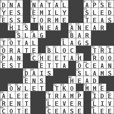 ACROSS 1. Heredity factor (abbr.) 4. Relating to or accompanying birth 9. Domed church section 13. Affirmative reply 14. Poet Dickinson 15. Downhill vehicle 16. Curvy letter 17. Singer Mel 18. Beverages made from leaves 19. Part of HMS, perhaps 21. Teachers' org. 22. Approach 24. Volcanic refuse 26. Drinking establishment 27. Add up to 29. Fails to keep up a pace 30. Declaim 31. Coalition 33. Three (prefix) 36. Baking dish 37. Leopard's kin 40. Friend of Pooh 41. Eastern Standard Time (abbr.) 42. Singer James 43. Sea 45. Raised platform 47. Criticizes harshly 48. Followers of ems 49. Froth on beer 50. A small or young owl 52. Ring climax 54. Madame (abbr.) 56. Toward shelter 57. _____ steamer (cargo ship) 59. Binary compound 61. Monthly bill 62. Crowbar 63. 54 in ancient Rome 64. ____ d'Azur (French Riviera) 65. Desist 66. Area sheltered from the wind DOWN 1. Color 2. Delicate 3. Aide 4. Fish or hair follower 5. Amid 6. Become fatigued 7. _ mater 8. Potassium hydroxide 9. Michaelmas daisies 10. Entreaty 11. Dry up 12. Begley and Asner 20. Narrow board 22. Phillipine bananalike plant 23. Tired old horse 25. Actor Baldwin 27. Drink excessively 28. Mouths or openings 29. Globular water bottle used in Asia 31. Wagers 32. Allow 33. Excercise machine 34. Wander 35. Charged atoms 38. Robbery 39. Flexible conduit 44. Dollar (slang) 45. Erase 46. One (Scot) 49. Residences 50. Butter sub 51. Gone 52. Woody plant 53. Polynesian shrub of the pepper family 55. Singer Brickell 56. Curve 57. Affectionate concern, for short 58. Before (prefix) 60. Night before a holiday