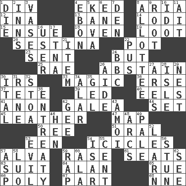 ACROSS 1. HTML Container Element 4. Made supply last 8. Roberta Peters solo 12. _ tizzy (2 wds.) 13. Object of repulsion 14. Farming town in central California 15. Follow as a consequence or result 18. Baking chamber 19. Plunder 20. French poetic form 22. Plant holder 23. Posted 24. Yet 25. Actress Charlotte 26. Refrain by choice 30. Big collection agency 33. Mysterious quality of enchantment 36. Celtic language 37. False hair 39. Directed 40. Snakelike fish 41. At once, immediately (arch.) 42. An organ shaped like a helmet 44. Put into a specified state 45. Cordwainer's material 47. Atlas unit 50. To separate or throw off 51. Of the mouth 53. Car or cant ending 54. Winter's stalactites 57. Inventor's middle name 59. Raze (variant) 61. Theater features 63. Costume for a special activity 64. Actor Alda or Thicke 65. Sorrow 66. Much (prefix) 67. Role in a play 68. Compass dir. DOWN 1. Expire 2. Taverns 3. Flower holders 4. Inky black, to poets 5. Polynesian shrub of the pepper family 6. Compass dir. 7. Lair 8. One to whom something is allotted 9. Carrot, for example 10. Wedding promise 11. Small island 16. One who uses or employs something 17. Inactive volcano in Sicily 21. A whole individual unit 22. Purulenc 24. English channel? 26. Helper 27. Ancient Greek god of war 28. Small island 29. Egg locale 30. Slanted text style (abbr.) 31. French philosopher Descartes 32. Portico 34. Having or resembling wings 35. Set 38. Plea 42. Unit of force equal to gravity 43. Mine, in Marseilles 46. Layer 48. Arches 49. Light colored 52. Acquire or gain knowledge or skills 53. Morally bad or wrong 54. Austrian river, tributary to the Danube 55. Penny 56. Surprise greatly 57. Cleo's killer 58. Nilotic language 59. Strike 60. Chicken ___ king 62. Observe