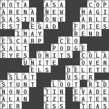ACROSS 1. Round or rotation of duties 5. White ___ sheet 8. Police officer (slang) 11. Sports stadium 13. ___ Haven, CT 14. Wise men 15. Indian antelope 16. Single 17. Competent 18. Eastern Standard Time (abbr.) 19. Mild oath 21. Strips of potato fried in deep fat 22. "If ____ say so..." 24. Tear apart 25. Fortification 27. Corporate head (abbr.) 29. Table seasoning 30. Porridge 32. Snake ____ (dice throw) 33. Leaves out 35. Root beer relative 39. Join together 41. Baking chamber 42. Raised railways 43. Keyboard key 45. Narrow board 48. One who makes use of a thing 49. Difficult or unusual or dangerous feat 50. Spoils 52. To free from 55. Words to Nanette 56. Shallow baking pan 57. Elude 59. Actor Alda or Thicke 60. Ending with capital 61. Eroded 62. For each 63. Double-curved letter 64. Beverages made from leaves DOWN 1. Raze (variant) 2. Mouths or openings 3. A testis 4. Cuckoo 5. Small Philippine buffalo 6. Transmit 7. Deep reverence 8. Apartment or room in a ship 9. Stared at amorously 10. Sliced desserts 12. Approach 14. Female horse 20. Con 21. Toadlike animal 23. Taiwanese island in East China Sea 25. Compass dir. 26. Declare 27. Small bed 28. Begley and Asner 30. Sliced dessert 31. Learning spot: Fr. 33. Petroleum 34. Mountains (abbr.) 36. Make much ado about nothing 37. Allow 38. One (Scot) 40. Remaining after all deductions 43. Superhero pair 44. First name in cosmetics 45. Fur scarf 46. Type of eclipse 47. Soon (poet.) 49. Fastener 50. Belonging to Elizabeth 51. Washington bills 53. The main thing one is thinking about 54. Hiding places for outlaws 56. Neckwear 58. Large container