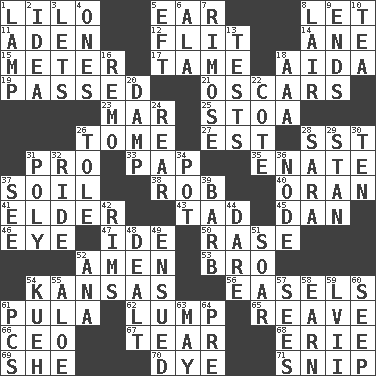 ACROSS 1. _ and Stitch 5. Hearing organ 8. Allow 11. An important port of Yemen 12. Sudden quick movement 14. A saturated hydrocarbon 15. Distance measurement 17. Docile 18. Opera by Verdi 19. Went by 21. Motion picture awards 23. Impair 25. Portico 26. Heavy book 27. Eastern Standard Time (abbr.) 28. Fast jet (abbr.) 31. Adept person 33. Infant food 35. Related on the mother's side 37. Earth 38. Director Reiner 40. NW Algerian seaport 41. A person who is older than you are 43. Small boy 45. One of the 12 tribes of Israel 46. Sight organ 47. Binary compound 50. Raze (variant) 52. So be it 53. Sis' sibling 54. Sunflower state 56. Artist's stands 61. Monetary unit of Botswana 62. Mass 65. Break or tear apart 66. Corporate head (abbr.) 67. Rend 68. 4th largest of the Great Lakes 69. A female animal or person 70. Color 71. Clip DOWN 1. Desk light 2. The content of cognition 3. Allows 4. Singles 5. Bank Draft (abbr.) 6. According to 7. Full of chinks, cracks, or crevices 8. Den 9. Extremities 10. Afternoon social gathering 13. Trials 16. San ____ (Riviera town) 18. American Automobile Association (abbr.) 20. Moist 22. ____ d'Azur (French Riviera) 24. Tail end 26. Lacquered or enameled metalware 28. "Two Mules for Sister ____" 29. Comedian Laurel of Laurel & Hardy 30. "___ Little Indians" 31. Much (prefix) 32. Travel on an animal 34. Plant holder 36. Thickened enlargement 37. Observe 39. Sharp remark 42. Basketball hoops 44. Have the gumption 48. Started a card game 49. Followed as a consequence or result 51. Fly high 52. Santa ___, CA 54. Malaysian steamed pastry 55. Medicinal plant 57. Perceives with the eye 58. Merit 59. 57 in ancient Rome 60. Ooze 61. Personal Computers (abbr.) 63. Fifth month 64. Before (prefix)