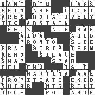 ACROSS 1. Object of repulsion 5. Benjamin's nick name 8. Fails to keep up a pace 12. It's straight from the horse's mouth 13. "We ___ not amused" (Victoria) 14. It is permitted: Lat. 15. Ancient Greek god of war 16. Rotating or pertaining to rotation 19. Nervous spasm 20. Choose not to consume 21. Snakelike fish 23. Had dinner 24. Actress Charlotte 27. Opera by Verdi 30. Old (Scot.) 31. Right away 34. _ gin 35. Part of Q.E.F. 38. Empty completely 40. Adolescent 41. Former U.S. Attorney General Janet 42. Fodder prepared in a silo 44. Fastener 45. Practice fight 46. Snakelike fish 47. Australian flightless bird 50. Small island 53. Chrissie's court nemesis 57. "___ Maria" 59. Appease 63. Made supply last 64. Bake eggs in their shells 65. Mountains (abbr.) 66. Painter Guido (1575-1642) 67. Lacquered or enameled metalware 68. Plant holder 69. Johnson of "Laugh-In" DOWN 1. Naughty child 2. Nest on high 3. Sibling's daughter 4. Followers of ems 5. Sharp remark 6. Greek god of love 7. Remaining after all deductions 8. 54 in ancient Rome 9. Adept person 10. Set 11. Filthy place 14. Actor's bit 17. Auto club (abbr.) 18. Teat (slang) 20. SW Saudi Arabia district 22. Portable computer 24. Court order 25. _ vera 26. Paradise 28. Two (Sp.) 29. Pismires 30. Michaelmas daisies 32. Three (prefix) 33. Petroleums 35. Celtic language 36. French philosopher Descartes 37. Of or related to the anus 39. Infant food 43. Greek goddess of the earth (variant) 47. Independent ruler or chieftain 48. Floor protector 49. RI univ. 51. Member of a famous L.A. basketball team 52. Incident 54. Pack (down) 55. "Tell ____ the Marines!" 56. Egg locale 58. Singer Brickell 59. Pacific Standard Time (abbr.) 60. 17th letter of the Greek alphabet 61. Petroleum 62. Before (prefix) 63. Epoch