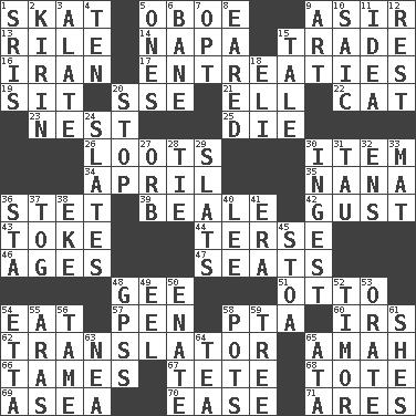 ACROSS 1. Three-handed card game 5. Mitch Miller's instrument 9. SW Saudi Arabia district 13. Cause heat under the collar 14. California wine valley 15. Buy and sell 16. SW Asia republic 17. Pleas 19. Be seated 20. Compass dir. 21. Pipe bend 22. Domesticated feline 23. A home for chicks 25. Pass on 26. Plunders 30. Detail 34. Showery time 35. Nanny 36. Proofreading order 39. Memphis, Tenn. Street 42. Abrupt rush of wind 43. Puff or smoke 44. Laconic 46. Eons 47. Theater features 48. Turn to the right 51. "Beetle Bailey" pooch 54. Ingest 57. Animal enclosure 58. Parent Teacher Assoc. 60. Big collection agency 62. Interpreter 65. Nursemaid 66. Makes less strong or intense 67. Wig 68. Carry 69. At sea 70. Relaxation 71. Ancient Greek god of war DOWN 1. Indian titles of respect 2. Japanese brewing company 3. Having winglike extensions 4. "___ Little Indians" 5. Washington bills 6. Object of repulsion 7. Elect 8. Having ears or earlike features 9. Nonscientific branch of learning 10. Ketch in the Levant 11. It may be bright or harebrained 12. Repose 15. Falsehood 18. Connecticut Ivy Leaguer 20. Discontinue 24. Chalkboards 27. Globe 28. Standoff 29. Narrow boards 30. Swallow 31. The 19th letter of the Greek alphabet 32. Followers of ems 33. Floor covering 36. R.R. building 37. Coat; cloak 38. Make supply last 40. Area sheltered from the wind 41. Period 45. Portico 48. Global Positioning Systems (abbr.) 49. Snakelike fish 50. Maternal 52. Southeast Indonesia island 53. Speak pompously 54. Singer James 55. Ancient river in northeast Turkey 56. Docile 58. Cooking vessels 59. Woody plant 61. "______ My Girl" (Turtles hit) 63. Teachers' org. 64. Beverage made from leaves 65. _ moment's notice (2 wds.)