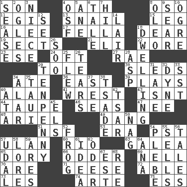 ACROSS 1. Male offspring 4. Pledge 8. Bear (Spanish) 11. Armor plate that protects the chest 13. Slow-paced one 15. Part of a journey 16. Toward shelter 17. Chap (slang) 18. Letter starter 19. Religious groups 21. Connecticut Ivy Leaguer 22. Had on 23. Compass dir. 24. Often (poetically) 27. Actress Charlotte 29. Lacquered or enameled metalware 30. Bobsleighs 34. Had dinner 36. 90 degrees 39. Romps 40. Actor Alda or Thicke 41. Take or capture by force 43. Is not 44. Grayish beige 46. Oceans 47. Born 48. Satellite of Uranus 49. Mild oath, euphamism for damn 51. Overdraft (abbr.) 53. Epoch 54. Pacific Standard Time (abbr.) 57. ____ Bator 60. _ de Janeiro 63. An organ shaped like a helmet 65. Rowboat 66. More peculiar 69. 1994 drama film starring Jodie Foster 70. "We ___ not amused" (Victoria) 71. Honkers 72. Competent 73. French article 74. Johnson of "Laugh-In" 75. Curvy letter DOWN 1. Gospel singer Marvin 2. Stares 3. Sibling's daughter 4. Order of Saint Francis (abbr.) 5. One (Scot) 6. Lie 7. Land elevation 8. Butter sub 9. Scorch 10. Legendary monster 12. Put into a specified state 14. Den 18. Residence 20. "Barney Miller" actor Jack 25. Soared 26. Pulls apart 28. Viper 29. 3-inch nail 31. Comfort 32. Centimeter-gram-second unit of force 33. Fast jet (abbr.) 34. Having or resembling wings 35. "Change" in Tahitian 37. Observe 38. Sadhe (variant) 40. _ moment's notice (2 wds.) 42. Russian ruler of old 45. Raised railways 50. Tired old horse 52. Tree-dwelling hopper 54. Military trainee 55. Makes a sale 56. Lies 57. Freehold land 58. Old wives' tales, e.g. 59. Ancient Greek god of war 61. The main thing one is thinking about 62. River in Europe 64. Santa ___, CA 67. Eastern Standard Time (abbr.) 68. To sift