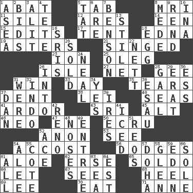 ACROSS 1. Blind as ____ 5. Bar bill 8. Medical imaging device (abbr.) 11. Drop; flow; fall 12. Ancient Greek god of war 14. Car or cant ending 15. Proofreads 17. Portable shelter 18. Pulitzer Prize-winning author Ferber 19. Michaelmas daisies 21. Burned superficially 23. Electrically charged atom 25. Cassini of fashion 26. Capri or Wright 27. Fish or hair follower 28. Unit of force equal to gravity 31. Acquire through effort 33. 24 hours 35. Rends 37. Scratch 38. Luau accessory 40. Oceans 41. Zeal 43. _ Lanka 45. The first octave above the treble staff 46. Modern: prefix 47. Compass dir. 50. Shade of tan 52. Soon (poet.) 53. Observe 54. Buttonhole 56. Evades 61. _ vera 62. Celtic language 65. Twentieth part of a lira 66. Allow 67. Perceives with the eye 68. The bottom of a shoe or boot 69. Area sheltered from the wind 70. Erode 71. Queen of England 1702-14 DOWN 1. At sea 2. Auction offers 3. Set down 4. Wig 5. Make lace 6. "We ___ not amused" (Victoria) 7. Gillaume's butler role 8. Ancient Persian 9. Tear apart 10. _ tizzy (2 wds.) 13. Vertical member of a panel or frame 16. Indian titles of respect 18. Ovum 20. Disposed of to a purchaser 22. Remaining after all deductions 24. Actress Patricia 26. To the inside or interior of 28. Highlander 29. Part of Q.E.F. 30. Double-curved letter 31. Past tense of be (plural) 32. _ china 34. It is so 36. He sold his birthright 37. One of the 12 tribes of Israel 39. Angers 42. Western Nevada city 44. On the rocks 48. Olfactory organs 49. Main course 51. Vintage cars 52. Adept person 54. Toward shelter 55. ____ d'Azur (French Riviera) 57. Capital of the state of Qatar 58. Small, secluded valley 59. Paradise 60. Flatfish 61. Everything 63. Ocean 64. Eastern Standard Time (abbr.)
