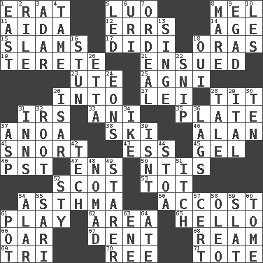 ACROSS 1. Part of Q.E.F. 5. Nilotic language 8. Cartoonist voice _ Blanc 11. Opera by Verdi 12. Blunders 14. Mature 15. Criticizes harshly 17. "You Light Up My Life" star Conn 18. Mouths or openings 19. Cylindrical with tapered ends 21. Followed as a consequence or result 23. Shoshoni 25. Hindu god of fire 26. To the inside or interior of 27. Luau accessory 28. Teat (slang) 31. Big collection agency 33. Cuckoo 35. Food holder 37. Small Philippine buffalo 38. What Jean-Claude Killy likes to do 40. Actor Alda or Thicke 41. Derisive sound 43. Double-curved letter 45. Set 46. Pacific Standard Time (abbr.) 47. Followers of ems 50. Nuclear Threat Initiatives 52. Highlander 53. Small child 54. Respiratory problem 56. Buttonhole 61. Live dramatic performance 62. Type of rug 65. Phone greeting 66. Rowing implement 67. Gouge 68. 480, 500 or 516 sheets of paper 69. Three (prefix) 70. Portuguese money of account (variant) 71. Carry DOWN 1. Compass direction 2. Cause heat under the collar 3. The sixth month of the Jewish calendar 4. Not wild 5. Directed 6. RI univ. 7. Severe or trying experience 8. Female horse 9. Mild oath 10. French article 13. Scorch 16. Astound 18. Fr. "Yes" 20. Singer James 22. Sever or remove by pinching or nipping 24. Immeasurably long periods of time 26. Austrian river, tributary to the Danube 28. Falsehood 29. Slanted text style (abbr.) 30. Nine, plus one 31. Lodging establishments 32. Carrot, for example 34. Mamie's husband 36. Falls behind 37. Viper 39. Is not 42. Georgia ____ (Atlanta school) 44. Portico 48. Roamer 49. A viewer who gazes fixedly 51. Hankering 52. Filthy place 54. Having or resembling wings 55. Indian skirt 57. An absolute certainty 58. Butter sub 59. Narrow board 60. Heavy book 61. Plant holder 63. Compass dir. 64. Had dinner