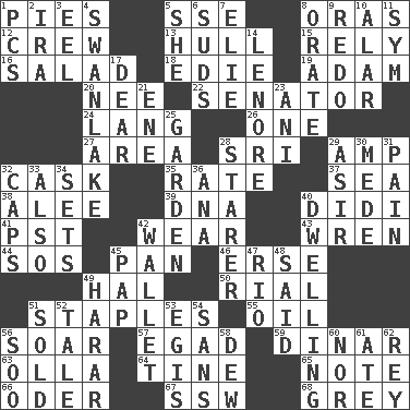 ACROSS 1. Sliced desserts 5. Compass dir. 8. Mouths or openings 12. Group working together 13. Frame or body of a ship 15. Trust 16. Vegetable dish 18. Singer Brickell 19. First man 20. Born 22. Elected representative 24. Long (Scottish) 26. Single 27. Length times width 28. Indian title of respect (Mr.) 29. Electrical Unit 32. Keg 35. Assign a rank or rating to 37. Ocean 38. Toward shelter 39. Heredity factor (abbr.) 40. "You Light Up My Life" star Conn 41. Pacific Standard Time (abbr.) 42. Put on (as clothing) 43. Songbird 44. Distress signal 45. Baking dish 46. Celtic language 49. Actor Linden 50. Monetary unit of Yemen 51. Paper fasteners 55. Lubricate 56. Fly high 57. Mild oath 59. Middle Eastern gold or silver currency 63. Rounded earthenware pot or jar 64. Prong on a fork 65. Make mention of 66. River in Europe 67. Compass dir. 68. Jennifer or Joel DOWN 1. Personal Computers (abbr.) 2. Retirement account (abbr.) 3. Snakelike fish 4. Tchaikovsky ballet 5. A female animal or person 6. Soap bubbles 7. Writer Wiesel 8. Declaim 9. Make new 10. Having or resembling wings 11. Symbol (abbr.) 14. Poe poem 17. Letter starter 21. Compass dir. 23. Black tropical American cuckoo 25. Place where plants grow 28. A viewer who gazes fixedly 29. SW Saudi Arabia district 30. Ancient Persian 31. Ache 32. Smile enhancers 33. In addition 34. Puts into a specified state 36. Santa ___, CA 40. Home 42. Place for singles 45. Infant food 47. River (Sp.) 48. Alleged 49. Ethiopian city, capital of Harari 51. Disposed of to a purchaser 52. Story 53. Armor plate that protects the chest 54. Without 56. "Barney Miller" actor Jack 58. Morning condensation 60. Or not 61. Had dinner 62. Marina Del _, California