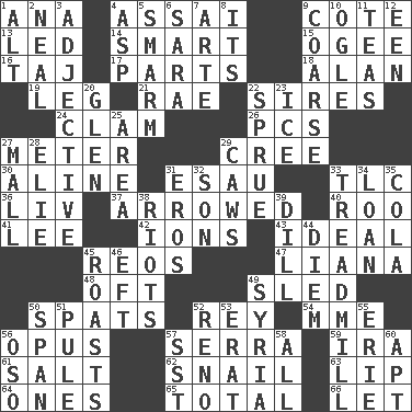 ACROSS 1. Santa ___, CA 4. Slender Brazilian palm 9. ____ d'Azur (French Riviera) 13. Directed 14. Don Adams' spy role 15. Double curve, resembling the letter S 16. _ Mahal 17. Pieces 18. Actor Alda or Thicke 19. Part of a journey 21. Actress Charlotte 22. Founders of families 24. Dollar (slang) 26. Personal Computers (abbr.) 27. Distance measurement 29. Algonquian 30. Place in a line 31. He sold his birthright 33. Affectionate concern, for short 36. 54 in ancient Rome 37. Moved like an arrow 40. Friend of Pooh 41. Area sheltered from the wind 42. Charged atoms 43. Standard of perfection 45. Vintage cars 47. Woody, climbing, usually tropical plant 48. Often (poetically) 49. Downhill vehicle 50. Arguments over trivial matters 52. Marina Del _, California 54. Madame (abbr.) 56. Musical composition 57. Spanish missionary in California 59. Retirement account (abbr.) 61. Table seasoning 62. Slow-paced one 63. Mouth edge 64. Singles 65. "_____ Recall" 66. Allow DOWN 1. Keyboard modifier key 2. Anneal 3. Descriptive word 4. Viper 5. Excessive but superficial compliments 6. "Two Mules for Sister ____" 7. Johnson of "Laugh-In" 8. ___ a Wonderful Life 9. Rough 10. Stare 11. Beverages made from leaves 12. Car or cant ending 20. Small, secluded valley 22. Upset 23. Frozen water 25. Type of rug 27. Promenade 28. Writer Wiesel 29. Crow sounds 31. Greek god of love 32. Male offspring 33. Excercise machine 34. Grant temporary use of 35. Root beer relative 38. Debaucheries 39. Deli pickle 44. South Vietnam president (1954) 45. Cooks with dry heat, as in an oven 46. Bank Draft (abbr.) 49. Damascus' land 50. Connect, as a bridge 51. Whine 52. Western Nevada city 53. Part of Q.E.F. 55. One of the Great Lakes 56. Bear (Spanish) 57. Fast jet (abbr.) 58. Everything 60. Fitting