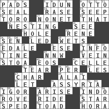 ACROSS 1. Writing tablets 5. Goddess of spring and wife of Bragi 9. Von Bismarck 13. Lick closed 14. To erase 15. Ooze 16. "Corrida" creature 17. Music written for nine 18. Not this but _ 19. Nestling 21. Perceive with the eye 22. Hollow 23. French philosopher Descartes 24. Elected rep. 27. Directed 28. Soaks 29. Peak District village in England 31. Compass dir. 32. Information 36. Prong on a fork 37. Compass dir. 38. Distinctive style or manner 39. Portico 40. Greek goddess of the dawn 41. Cell (Danish) 42. Separate forcefully 44. For each 46. French article 47. Burn to charcoal 48. Mountain range southwest of Kyrgyzstan 50. Allow 51. Nineveh was its capital 54. Composer Stravinsky 56. Get up 58. Southeast Asian peninsula 60. Be footloose 61. Travel on an animal 62. Play the lead 63. Hurried 64. Frog relative 65. Israeli folk dance DOWN 1. Pacific Standard Time (abbr.) 2. Age 3. Have the gumption 4. Splash clumsily 5. Pressed 6. Mild oath, euphamism for damn 7. Purpose 8. Fish or hair follower 9. Clearly or manifestly demonstrative 10. Giggle 11. Beverage made from leaves 12. Elect 17. The longest river in the world 20. Lacquered or enameled metalware 21. Put into a specified state 23. Portuguese money of account (variant) 24. Puts into a specified state 25. Prepare for publication 26. Billionth: prefix 28. Compass dir. 30. Resembling or made to resemble leather 31. Followers of ems 33. 1994 drama film starring Jodie Foster 34. Do some clerical work 35. Singles 37. Or not 40. Ewer handle 41. Supercomputer manufacturer 43. Consume 44. Went by 45. Otherwise 47. Garlic unit 49. From or relating to Ireland 51. Opera by Verdi 52. To the inside or interior of 53. The sixth month of the Jewish calendar 54. Big collection agency 55. Grand Old Party 56. Nonscientific branch of learning 57. River (Sp.) 59. Mouth or opening