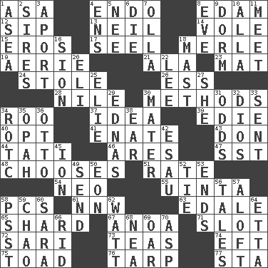 ACROSS 1. White ___ sheet 4. Inside; within (prefix) 8. Dutch treat 12. Small drink 13. Famous astronaut Armstrong 14. Short-tailed, large-bodied rat 15. Greek god of love 17. Sew up the eyelids of hawks and falcons 18. Haggard of country music 19. Nest on high 21. According to 23. Floor protector 24. Took without asking 26. Double-curved letter 28. The longest river in the world 30. Modes 34. Friend of Pooh 37. It may be bright or harebrained 39. Singer Brickell 40. Choose 41. Maternal 43. Spanish title 44. Jacques of French films 46. Ancient Greek god of war 47. Fast jet (abbr.) 48. Opts 51. Pace 54. Modern: prefix 55. National forest in Provo, Utah 58. Personal Computers (abbr.) 61. Compass dir. 63. Peak District village in England 65. Pottery fragment 67. Small Philippine buffalo 71. Narrow opening 72. Indian skirt 73. Afternoon social gatherings 74. Lizard (obsolete) 75. Frog relative 76. Canvas cover 77. R.R. building DOWN 1. At sea 2. Male parents of animals 3. To the left, to Queeg 4. Followers of ems 5. Born 6. Pass on 7. Rounded earthenware pot or jar 8. First lady 9. Dormintory (informal) 10. Silent film actress Nazimova 11. Confront 16. The Jewish people; Israel 18. Vertical spar for supporting sails 20. Connecticut Ivy Leaguer 22. Area sheltered from the wind 25. Writer Wiesel 27. A female animal or person 29. Ferber et al. 30. Mother 31. Likelihood 32. "Vaya con ____" 33. Posted 34. College mil. group 35. Brightly colored fish 36. Von Bismarck 38. Ewer handle 42. He sold his birthright 45. Electrically charged atom 49. Transmit 50. Period of immesurable duration 52. Standoff 53. Extremities 56. Lies 57. At or to great height 58. Inconspicuous attention getter 59. US Secretary of Labor Elaine L. _ 60. "Two Mules for Sister ____" 62. Electrical Unit 64. Singer James 66. To free from 68. Teachers' org. 69. Boat paddle 70. Cleo's killer