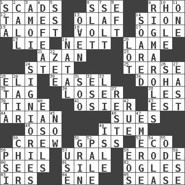 ACROSS 1. Loads 6. Compass dir. 9. 17th letter of the Greek alphabet 12. Domesticates 13. Norwegian king 14. The Jewish people; Israel 15. High up in or into the air 16. Electrical Unit 17. Stare 18. Whopper 19. Remaining after all deductions 20. Unable to walk 21. Muslim summons to prayer 23. Mouth or opening 24. Proofreading order 25. Laconic 28. Connecticut Ivy Leaguer 30. Artist's stand 34. Capital of the state of Qatar 35. Label 36. Failure 38. French article 39. Prong on a fork 41. Flexible twig of a willow tree 43. Eastern Standard Time (abbr.) 44. Believer in; advocate of (suffix) 46. Takes to court 48. Bear (Spanish) 49. A distinct part 50. Group working together 51. Global Positioning Systems (abbr.) 53. Environmental prefix 56. Silvers or Donahue 57. Mountain range 58. Eat (away) 60. Perceives with the eye 61. Filth; sediment 62. Stares 63. Big collection agency 64. Compass dir. 65. Gospel singer Marvin DOWN 1. R.R. building 2. Give a ring to 3. Mine, in Marseilles 4. Outscore 5. Fast jet (abbr.) 6. Position in a hierarchy or organization 7. Table seasoning 8. Newt 9. Frustrating wastes of time 10. Opening into or through something 11. Single 13. Baking chamber 14. Flew 19. Relating to or accompanying birth 20. Car dealer's back yard 22. Last letter of the English alphabet 24. Seigniories (variant) 26. "______ My Girl" (Turtles hit) 27. 90 degrees 28. Singer James 29. Den 31. "Barney Miller" actor Jack 32. Curvy letter 33. Luau accessory 37. Musical pauses 40. Artist's stands 42. Regret 45. Immediately 47. Develop 49. Small island 50. "Mermaids" star 51. Broad smile 52. Diluted with white 54. Root beer relative 55. Lyric poems 56. Air pressure measure (abbr.) 57. Purpose 58. Greek goddess of the dawn 59. Compass dir.