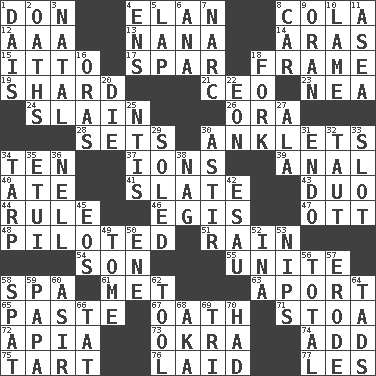 ACROSS 1. Spanish title 4. Flair 8. Root beer relative 12. Auto club (abbr.) 13. Nanny 14. Ancient river in northeast Turkey 15. "Tell ____ the Marines!" 17. Practice fight 18. Movie unit 19. Broken piece 21. Corporate head (abbr.) 23. Teachers' org. 24. Killed 26. Mouth or opening 28. Puts into a specified state 30. Short socks 34. "___ Little Indians" 37. Charged atoms 39. Of or related to the anus 40. Had dinner 41. Schedule 43. Superhero pair 44. Governing power 46. The front part of a cuirass 47. Baseball player Mel 48. Manned the helm 51. Water falling in drops from the sky 54. Manchild 55. Join together 58. Health resort 61. Was introduced to 63. To the left, to Queeg 65. Thick mixture 67. Pledge 71. Portico 72. Capital of Western Samoa 73. Gumbo ingredient 74. Say or write further 75. Small pie 76. Put down 77. French article DOWN 1. Raised platform 2. Profane or obscene expressions 3. Relating to or accompanying birth 4. Followers of ems 5. Pet locale 6. Santa ___, CA 7. Drug cop 8. Automobile 9. NW Algerian seaport 10. Unable to walk 11. At sea 16. Mouths or openings 18. Tined utensil 20. Expire 22. Period of immesurable duration 25. Nuclear Threat Initiatives 27. According to 29. Having a sole or soles 30. Being in motion 31. Inside; within (prefix) 32. Drawn tight 33. Narrow opening 34. Canvas cover 35. Needle holder 36. 1994 drama film starring Jodie Foster 38. Tired old horse 42. He sold his birthright 45. Greek goddess of the dawn 49. Heavy book 50. Compass dir. 52. _ tizzy (2 wds.) 53. Pinches, bites 56. "_____ Recall" 57. Wear away 58. Argument over a trivial matter 59. Dad 60. SW Saudi Arabia district 62. Implement 64. Bits 66. Make lace 68. Alias (abbr.) 69. Three (prefix) 70. Possessed
