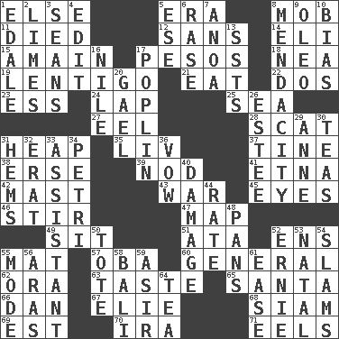 ACROSS 1. Otherwise 5. Period 8. Disorderly crowd 11. Passed on 12. Without 14. Biblical high priest 15. With great haste 17. Mexican monetary units 18. Teachers' org. 19. Small, flat, pigmented spot on the skin 21. Ingest 22. Two (Sp.) 23. Curvy letter 24. Infant locale 25. Ocean 27. Snakelike fish 28. Jazz singing style 31. Pile 35. 54 in ancient Rome 37. Prong on a fork 38. Celtic language 39. Lower and raise head in agreement 41. Inactive volcano in Sicily 42. Vertical spar for supporting sails 43. Armed conflict 45. Snake ____ (dice throw) 46. Use a swizzle stick 47. Atlas unit 49. Be seated 51. "One Day ___ Time" 52. Followers of ems 55. Floor covering 57. Chief or king in Benin or Nigeria 60. Commissioned military rank 62. Mouth or opening 63. Clothes sense 65. Before Barbara or Clara 66. Daniel's nick name 67. Writer Wiesel 68. Thailand, formerly 69. Eastern Standard Time (abbr.) 70. Lyricist Gershwin 71. Snakelike fish DOWN 1. Peak District village in England 2. Citrus fruits 3. Seines 4. Prepare for publication 5. Compass dir. 6. To erase 7. Small Philippine buffalo 8. Ananias' fault 9. Butter sub 10. Prejudice 13. Fast planes 16. "Death on the ____" 17. Cotton for raincoats, e.g. 20. Highlander 26. First name in cosmetics 29. Queen of England 1702-14 30. Afternoon social gatherings 31. Folds over and sews together 32. Part of Q.E.F. 33. Aide 34. _ dish (used to culture cells) 36. Promise 40. Break 44. Assign a rank or rating to 48. Baking dishes 50. Carryall 52. Bert's buddy 53. Relating to or accompanying birth 54. Criticizes harshly 55. Method 56. Ancient river in northeast Turkey 58. Indonesian resort city 59. SW Saudi Arabia district 61. Comfort 64. Beverage made from leaves