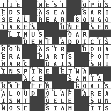 ACROSS 1. Make a knot 4. 270 degrees 8. Musical composition 12. Begley and Asner 13. At sea 14. Indian skirt 15. Lick closed 17. Rump 18. Beat drum 19. Receives possession of 21. Single 23. Elected rep. 24. "_ and Lucy" (Charlie Brown theme song) 26. Boat paddle 28. Incision 30. Inveterate users 34. Director Reiner 37. SW Saudi Arabia district 39. Capital of the state of Qatar 40. Period 41. Components 43. Plant holder 44. Drug cop 46. Raised platform 47. _ Lanka 48. Heighten or intensify 51. Inactive volcano in Sicily 54. Adept person 55. Before Barbara or Clara 58. Actress Charlotte 61. Car or cant ending 63. Purposes of endeavors 65. Verbally 67. Norwegian king 71. Length times width 72. Is not 73. Ubangi River tributary 74. Player for Phoenix 75. Olfactory organ 76. Thailand, formerly 77. It is DOWN 1. Trial 2. Perfect 3. 1973 Nobel Price Winner (Physics) Leo 4. Armed conflict 5. Compass dir. 6. Ocean 7. Pacific island yam 8. Bear (Spanish) 9. Baking dishes 10. Goad 11. The Jewish people; Israel 16. Grant temporary use of 18. Necklace unit 20. Take to court 22. Lower and raise head in agreement 25. Fastener 27. To free from 29. Sadhe (variant) 30. Nick name for Arthur 31. 911 reaches them 32. Son of Odin 33. Suttee (variant) 34. Painter Guido (1575-1642) 35. Northwest Algerian city 36. Long, evenly shaped pieces 38. Lyricist Gershwin 42. Fast planes 45. Tax preparer (abbr.) 49. On the rocks 50. To separate or throw off 52. Tired old horse 53. Small Philippine buffalo 56. Tarsus (plural) 57. Eskimo relative 58. Precipitation 59. In addition 60. Immeasurably long periods of time 62. Common sense 64. Without 66. Shoshoni 68. Flowery wreath 69. Wing 70. Opposite of masc.
