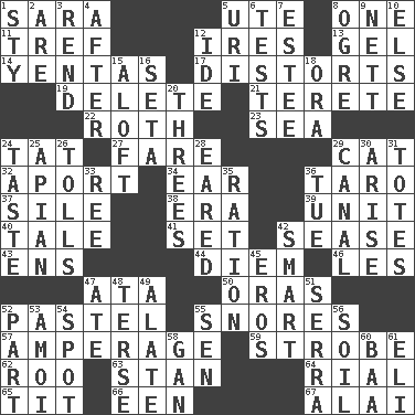 ACROSS 1. "Two Mules for Sister ____" 5. Shoshoni 8. Single 11. Not kosher 12. Angers 13. Set 14. Gossips 17. What propaganda does 19. Erase 21. Cylindrical with tapered ends 22. Writer of Portnoy's Complaint (1969) 23. Ocean 24. Make lace 27. Conductor's collection 29. Domesticated feline 32. To the left, to Queeg 34. Hearing organ 36. Edible starchy tuberous root 37. Drop; flow; fall 38. Period 39. A single undivided whole 40. Story 41. Arrange properly for use 42. Gospel singer Marvin 43. Followers of ems 44. South Vietnam president (1954) 46. French article 47. "One Day ___ Time" 50. Mouths or openings 52. Soft color 55. Sounds asleep 57. Electrical Measurement 59. Disco prop 62. Friend of Pooh 63. Comedian Laurel of Laurel & Hardy 64. Monetary unit of Yemen 65. Teat (slang) 66. Car or cant ending 67. Jai ____ DOWN 1. Filthy place 2. "We ___ not amused" (Victoria) 3. Tear apart 4. Following 5. RI univ. 6. Trials 7. First name in cosmetics 8. Legendary monster 9. Remaining after all deductions 10. Otherwise 12. Binary compound 15. High up in or into the air 16. Bristle 18. Mouth or opening 20. Threesomes 24. Clothes sense 25. Bee-related 26. For Whom the Bell _____ 28. Having ears or earlike features 29. Lessep's creation 30. Ascend 31. Lugs 33. To separate or throw off 35. Food allowance for one day 36. Third day of the wk. 42. Don Adams' spy role 45. Greek god of love 47. Had dinner 48. Laconic 49. Having winglike extensions 51. Father Junipero _ 52. Component 53. Mine, in Marseilles 54. Blemish 55. Elected rep. 56. The visible part of the earth's surface 58. Separate the seeds from cotton 60. Sound made by sheep 61. Connecticut Ivy Leaguer