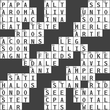 ACROSS 1. Dad 5. Keyboard modifier key 8. Fast jet (abbr.) 11. Odor 13. 54 in ancient Rome 14. To (old English) 15. Pale purple color 16. _ tizzy (2 wds.) 17. Land 18. Ingest 19. False hair 21. Haggard of country music 22. Vintage cars 24. Johnson of "Laugh-In" 25. Oak nuts 27. Part of a journey 29. Within a short period 30. Ms. Damita and namesakes 32. Hindu god of fire 33. Gives food to 35. Casino tip 39. Peak District village in England 41. Advice 42. Black tropical American cuckoo 43. Electrical Unit 45. Suttee (variant) 48. Cowardly lion portrayer 49. Radiant circles of light 50. Comedian Laurel of Laurel & Hardy 52. To free from 55. Southwest Nigerian state 56. Observe 57. Related on the mother's side 59. Proofreading order 60. Numbers guy (abbr.) 61. "_____ Recall" 62. Hearing organ 63. It is 64. Not ill DOWN 1. Diluted with white 2. Roberta Peters solo 3. Coward 4. Nanny (var.) 5. Set down 6. Actor's bit 7. Federal power corp. 8. Derisive sound 9. Vertical member of a panel or frame 10. Lacquered or enameled metalware 12. Gambison 14. One who makes use of a thing 20. Double-curved letter 21. Wise men 23. Bert's buddy 25. White ___ sheet 26. Gear tooth 27. Hat (slang) 28. Raised railways 30. Area sheltered from the wind 31. Staphylococcus 33. Air blower 34. Biblical high priest 36. Make much ado about nothing 37. Apertif with cassis 38. Compass dir. 40. Raised platform 43. Chicken ___ king 44. French painter Edouard 45. Before Barbara or Clara 46. Tree or shrub in the Birch family 47. A blast of a horn 49. Flexible conduit 50. Back-to-school mo. 51. Beverages made from leaves 53. Slanted text style (abbr.) 54. Small valley 56. _-fi 58. At this time
