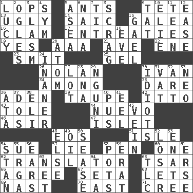 ACROSS 1. Chops off 5. Pismires 9. False hair 13. Unsightly 14. Ketch in the Levant 15. An organ shaped like a helmet 16. Burrowing marine mollusk 17. Pleas 19. It is so 20. Auto club (abbr.) 21. "___ Maria" 22. Compass dir. 23. Stricken, poetically 25. Set 26. Pitcher Ryan 30. _ the terrible 34. Amid 35. Have the gumption 36. Arabian gulf 39. Grayish beige 42. "Tell ____ the Marines!" 43. Lacquered or enameled metalware 44. New (sp.) 46. SW Saudi Arabia district 47. Small island 48. Greek goddess of the dawn 51. Small island 54. Take to court 57. Untruth 58. Animal enclosure 60. Single 62. Interpreter 65. Russian ruler of old 66. Match 67. Bristle 68. Allows 69. Political cartoonist Thomas 70. Compass direction 71. Algonquian DOWN 1. "I Love _" 2. Stares at amorously 3. Suffix with ecto or cyto 4. Symbol (abbr.) 5. Toward the sea 6. Grandmother 7. Teat (slang) 8. Strangle with an iron collar 9. Make lace 10. Writer Wiesel 11. Adolescent 12. Relaxation 15. Highlander 18. First lady 20. Tiny particle 24. Sillier 27. Car dealer's back yard 28. Santa ___, CA 29. Group of southern Bantu languages 30. Foolish or stupid persons 31. Large container 32. Tate display 33. Modern: prefix 36. _ moment's notice (2 wds.) 37. Two (Sp.) 38. Biblical high priest 40. Purulenc 41. Snakelike fish 45. Distinctive style or manner 48. Otherwise 49. Petroleum 50. Gospel singer Marvin 52. Failure 53. Maternal 54. Comedian Laurel of Laurel & Hardy 55. Capital and largest city of Mongolia 56. Hearing organs 58. Cooking vessels 59. Part of Q.E.F. 61. Celtic language 63. Fish or hair follower 64. Afternoon social gathering 65. Affectionate concern, for short