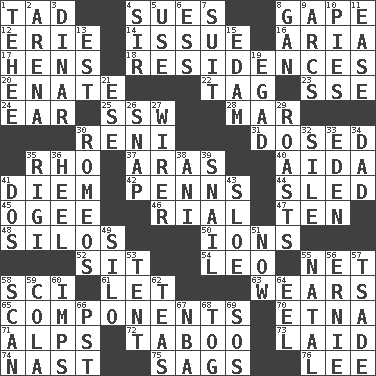 ACROSS 1. Bit 4. Institutes legal proceedings 8. Stare wonderingly 12. 4th largest of the Great Lakes 14. Come out of 16. Operatic vocal solo 17. Coop moms 18. Homes 20. Related on the mother's side 22. Label 23. Compass dir. 24. Ewer handle 25. Compass dir. 28. Make imperfect 30. Painter Guido (1575-1642) 31. Administered medicine 35. 17th letter of the Greek alphabet 37. Caspian sea tributary 40. Opera by Verdi 41. South Vietnam president (1954) 42. Actor Sean's family 44. Downhill vehicle 45. Double curve, resembling the letter S 46. Monetary unit of Yemen 47. "___ Little Indians" 48. Grain storage towers 50. Charged atoms 52. Be seated 54. Lion 55. Fish or hair follower 58. _-fi 61. Allow 63. Erodes 65. Parts 70. Inactive volcano in Sicily 71. High mountains 72. Off limits 73. Put down 74. Political cartoonist Thomas 75. Sinks 76. Area sheltered from the wind DOWN 1. Giggle 2. Sports stadium 3. Middle Eastern gold or silver currency 4. Title for a knight 5. Purpose 6. Double-curved letter 7. Costume for a special activity 8. Separate the seeds from cotton 9. Curves 10. Sliced desserts 11. Relaxation 13. Eastern Standard Time (abbr.) 15. Dutch treat 19. Mild oath 21. Compass dir. 26. Fastener 27. One who wires 29. Ridicules or criticizes harshly 30. Lover boys 32. Drop; flow; fall 33. Locale of original sin 34. June honoree 35. Swiss mountan, "Queen of the Mountains" 36. The bottom of a shoe or boot 38. Black tropical American cuckoo 39. Slow-paced one 41. Two (Sp.) 43. _ gin 49. Grain storage tower 51. At this time 53. Portable shelter 55. Relating to or accompanying birth 56. Bert's buddy 57. Sadhe (variant) 58. Examine minutely or intensely 59. Root beer relative 60. Naughty children 62. Beverages made from leaves 64. Snakelike fish 66. Pacific Standard Time (abbr.) 67. Basketball assoc. 68. Coat; cloak 69. Distress signal