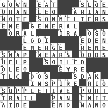 ACROSS 1. Long dress 5. Consume 8. _ gin 12. Northwest Algerian city 13. Lion 14. Believer in; advocate of (suffix) 15. Make mention of 16. Wine waiters 19. Compass dir. 20. Commissioned military rank 21. Taken by mouth 23. Retirement account (abbr.) 24. Bear (Spanish) 27. Farming town in central California 30. Genesis locale 31. Develop 34. French philosopher Descartes 35. Fastener 38. Erodes 40. Probability 41. Assist 42. Dirtied 44. Margarine 45. Jane of fiction 46. Affectionate concern, for short 47. Two (Sp.) 50. Neighbor of Neb. 53. Motivate 57. River (Sp.) 59. Supplying deficiencies 63. Left side of a ship or aircraft 64. Drop behind 65. Baking dish 66. Give off 67. Helper 68. Conclude 69. Billionth: prefix DOWN 1. Went 2. U. of Maine site 3. Wetness 4. Compass dir. 5. Otherwise 6. A really long time 7. Heavy book 8. _ Lanka 9. Falsehood 10. Boat paddle 11. Followers of ems 14. Silent film actress Nazimova 17. Medical imaging device (abbr.) 18. Ewer handle 20. Seize upon or latch onto something 22. City in Syria 24. Wrote a lyric poem 25. Post 26. Singles 28. Morning condensation 29. Angers 30. Worn away 32. E Mali city 33. One of the Great Lakes 35. Went for two points 36. 1994 drama film starring Jodie Foster 37. Actor Baldwin 39. Mischievous 43. Celtic language 47. Deli pickle 48. Single 49. Fast jet (abbr.) 51. Scent 52. Japanese brewing company 54. Corncob 55. _ the terrible 56. Tear apart 58. Von Bismarck 59. R.R. building 60. RI univ. 61. Writing tablet 62. Sliced dessert 63. Writing instrument