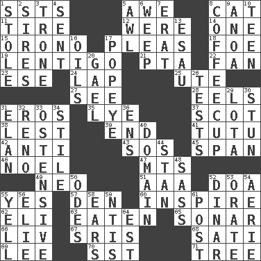 ACROSS 1. Fast planes 5. Deep reverence 8. Feline 11. Become fatigued 12. Past tense of be (plural) 14. Single 15. U. of Maine site 17. Entreaties 18. Enemy 19. Small, flat, pigmented spot on the skin 21. Parent Teacher Association (abbr.) 22. Avid follower 23. Compass dir. 24. Infant locale 25. Shoshoni 27. Perceive with the eye 28. Snakelike fish 31. Greek god of love 35. Potassium hydroxide 37. Native of Scotland 38. For fear that 39. Conclude 41. Ballerina skirt 42. Against 43. Mayday 45. Connect, as a bridge 46. Christmas carol 47. Mountains (abbr.) 49. Modern: prefix 51. American Automobile Association (abbr.) 52. ___ good deed 55. Affirmative reply 57. Lair 60. Stimulate to action 62. Biblical high priest 63. Consumed 65. Echolocation 66. 54 in ancient Rome 67. Indian titles of respect 68. Suttee (variant) 69. Area sheltered from the wind 70. Fast jet (abbr.) 71. Family _ (genealogy) DOWN 1. Fur scarf 2. Fathers 3. Heavy duty weighing machine 4. Emitted 5. Leather borer 6. Shed a tear 7. Part of Q.E.F. 8. Java holder (2 wds.) 9. Small Philippine buffalo 10. Adolescent 13. He sold his birthright 16. Petroleums 17. Wimpy's pal 20. Highlander 26. Trials 29. Globular water bottle used in Asia 30. Surprise greatly 31. Style 32. Former U.S. Attorney General Janet 33. Clearly or manifestly demonstrative 34. Vertical member of a panel or frame 36. Followers of ems 40. Kingdom 44. Comedian Laurel of Laurel & Hardy 48. Backtalk 50. Lyric poems 52. Middle Eastern gold or silver currency 53. Declaim 54. Nest on high 55. Shout 56. Writer Wiesel 58. Hearing organs 59. Nuclear Threat Initiatives 61. Mail 64. Eastern Standard Time (abbr.)