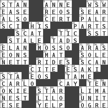 ACROSS 1. Comedian Laurel of Laurel & Hardy 5. Queen of England 1702-14 9. Compass dir. 12. Relaxation 13. Vintage cars 14. Scorch 15. In addition 16. Foregone conclusion 17. Diluted with white 18. _-fi 19. Part of HMS, perhaps 21. Components 22. Go away! 24. Nervous spasm 26. Fast jet (abbr.) 27. Having lost freshness 28. Small amounts or degrees 29. Liveliness 30. With motion or animation 32. Ancient river in northeast Turkey 36. Immeasurably long periods of time 37. Floor covering 38. Flatfish 39. Remaining after all deductions 40. Amusement-park features 42. Skim 43. Quote 44. 1973 Nobel Price Winner (Physics) Leo 46. R.R. building 49. Greek goddess of the dawn 50. Docile 51. Monte _, Las Vegas Hotel/Casino 53. Island 54. Nine, plus one 57. Migrant worker of the '30s 58. Play the lead 61. Pale green bean 62. A home for chicks 63. _ and Stitch 64. A single undivided whole 65. Compass dir. 66. Sharp bark 67. Legendary monster DOWN 1. Oceans 2. Baby powder 3. Helper 4. Modern: prefix 5. Arches 6. Born 7. And not 8. Eastern Standard Time (abbr.) 9. Erodes 10. Table seasonings 11. Take or capture by force 14. Health resort 19. Actor Linden 20. A distinct part 21. Personal Computers (abbr.) 23. 2nd pers. sing. pres. of can (arch.) 24. Clothes sense 25. Wedding promise 27. A type of plum 28. Sadhe (variant) 29. Car or cant ending 31. Leaves out 32. Indian state 33. Shooting up abruptly 34. Jai _ 35. Elected rep. 40. River (Sp.) 41. Bristle 43. Corporate head (abbr.) 45. Declare 46. Biscuitlike quick bread 47. Receives possession of 48. Ascend 52. Allow 53. Riding implement 55. Independent ruler or chieftain 56. Nathan's nickname 58. Mischievous 59. Neckwear 60. Everything 61. Nilotic language