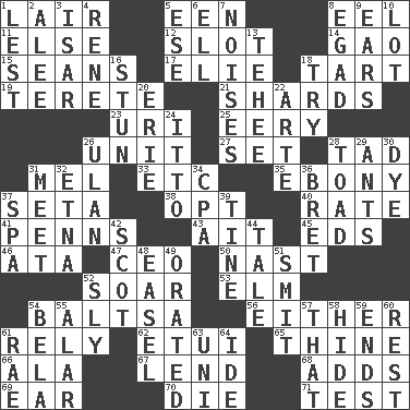 ACROSS 1. Den 5. Car or cant ending 8. Snakelike fish 11. Otherwise 12. Narrow, elongated depression 14. E Mali city 15. Actors Connery and Penn 17. Writer Wiesel 18. Small pie 19. Cylindrical with tapered ends 21. Broken pieces 23. RI univ. 25. Suggestive of the supernatural 26. A single undivided whole 27. Put into a specified state 28. Bit 31. Cartoonist voice _ Blanc 33. And so on (abbr.) 35. Black 37. Stalk of a moss capsule 38. Choose 40. Pace 41. Actor Sean's family 43. Small island 45. Begley and Asner 46. "One Day ___ Time" 47. Corporate head (abbr.) 50. Political cartoonist Thomas 52. Fly high 53. Shade tree 54. Greek mezzo-soprano Agnes 56. One or the other of two 61. Have trust in 62. Needle holder 65. One or ones belonging to thee 66. According to 67. Grant temporary use of 68. Does sums 69. Ewer handle 70. Pass on 71. Trial DOWN 1. For fear that 2. Toward shelter 3. Austrian river, tributary to the Danube 4. French philosopher Descartes 5. Compass dir. 6. Pipe bend 7. Annoying sounds 8. Mild oath 9. Hearing organs 10. Car dealer's back yard 13. Giggle 16. Astound 18. Attempt to accomplish something 20. One of the Great Lakes 22. Johnson of "Laugh-In" 24. "Tell ____ the Marines!" 26. Uhlan (variant) 28. Frog relative 29. Pismires 30. Color 31. Rendezvous 32. Inactive volcano in Sicily 34. Accounting whiz (abbr.) 36. Cy Young winner Saberhagen 37. Health resort 39. Prong on a fork 42. Native of Scotland 44. Lie 48. Artist's stand 49. Spoke pompously 51. Stricken, poetically 52. Cunning 54. Actor Lugosi 55. Having or resembling wings 57. Not this but _ 58. Flintstone garb 59. Conclusions 60. Repose 61. Actress Charlotte 63. Corn or form start 64. Binary compound