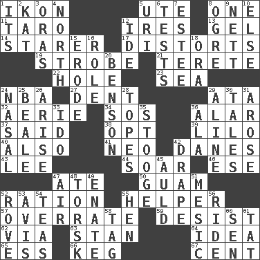 ACROSS 1. Picture 5. Shoshoni 8. Single 11. Edible starchy tuberous root 12. Angers 13. Set 14. A viewer who gazes fixedly 17. What propaganda does 19. Disco prop 21. Cigar-shaped 22. Hollow 23. Ocean 24. Basketball assoc. 27. Incision 29. _ moment's notice (2 wds.) 32. Nest on high 34. Mayday 36. Having or resembling wings 37. Expressed in words 38. Elect 39. _ and Stitch 40. In addition 41. Modern: prefix 42. Natives or inhabitants of Denmark 43. Area sheltered from the wind 44. Fly high 46. Compass dir. 47. Had dinner 50. Island territory of the United States 52. Food allowance for one day 55. Aide 57. Make much ado about nothing 59. Cease 62. By way of 63. Comedian Laurel of Laurel & Hardy 64. The main thing one is thinking about 65. Curvy letter 66. Barrel 67. Penny DOWN 1. ___ a Wonderful Life 2. Krazy ___ of comics 3. Mouths or openings 4. _ pole 5. RI univ. 6. Trials 7. First name in cosmetics 8. Legendary monster 9. Remaining after all deductions 10. Otherwise 12. Binary compound 15. Wear away 16. Hero or heavy, e.g. 18. Mouth or opening 20. Gillaume's butler role 24. Relating to the nose 25. Calif. Air Force Base 26. Get up 28. Drinks excessively 29. Place in a line 30. Falsehoods 31. Came up 33. Wedding promise 35. Moe Howard, for one 36. In the manner of 42. Window treatment 45. Old (Scot.) 47. Wind 48. Cod relative 49. Maternal 51. Of or pertaining to a meson 52. Be footloose 53. Opinion 54. Beverages made from leaves 55. Layer 56. Travel on or in a vehicle 58. Label 60. Elected rep. 61. Make lace