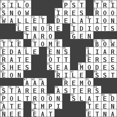 ACROSS 1. Grain storage tower 5. Pacific Standard Time (abbr.) 8. Three (prefix) 11. Overwhelm 12. Angers 13. Friend of Pooh 14. Place for singles 17. Conveyance 19. Poe poem 21. Foolish or stupid persons 22. Edible starchy tuberous root 23. Commissioned mil. rank 24. Neckwear 27. Heavy book 29. Arrow shooter 32. Peak District village in England 34. Followers of ems 36. One who doesn't tell the truth 37. Assign a rank or rating to 38. Baseball player Mel 39. Celtic language 40. "______ My Girl" (Turtles hit) 41. Ocean 42. Methods 43. Period of immesurable duration 44. Cause heat under the collar 46. Fast jet (abbr.) 47. Auto club (abbr.) 50. San ____ (Riviera town) 52. A viewer who gazes fixedly 55. Michaelmas daisies 57. Coward 59. Scheduled 62. Had dinner 63. Body of Kaffir warriors 64. Adolescent 65. Born 66. Erode 67. Inactive volcano in Sicily DOWN 1. Compass dir. 2. _ tizzy (2 wds.) 3. Hang loosely or laxly 4. A small or young owl 5. Before (prefix) 6. Former Milwaukee Brewers owner Bud 7. Sadhe (variant) 8. Musical group of three 9. Carrot, for example 10. Charged particles 12. Binary compound 15. Related on the mother's side 16. "Corrida" creature 18. Metal container 20. Lover boys 24. Laconic 25. Potato state 26. Consumed 28. Keyboard key 29. Avian creatures 30. Fertile tracts in a desert 31. Obtain by seizing forcibly or violently 33. French article 35. Flight of steps 36. Lion 42. Klaipeda city 45. Allows 47. Nonscientific branch of learning 48. Nest on high 49. Odor 51. Declaim 52. Connect, as a bridge 53. Lug 54. Toward shelter 55. Cuckoo 56. Proofreading order 58. Elect 60. Car or cant ending 61. Heredity factor (abbr.)