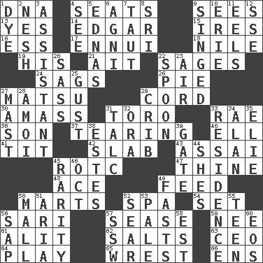 ACROSS 1. Heredity factor (abbr.) 4. Theater features 9. Observes 13. It is so 14. _ Allan Poe 15. Angers 16. Double-curved letter 17. World-weariness 18. "Death on the ____" 19. Part of HMS, perhaps 21. Small island 22. Gurus 24. Droops 26. Sliced dessert 27. Taiwanese island in East China Sea 29. Drawstring 30. Collect or gather 31. "Corrida" creature 33. Actress Charlotte 36. Male child 37. Rending 40. Pipe bend 41. Teat (slang) 42. Thick slice 43. Slender Brazilian palm 45. College mil. group 47. One or ones belonging to thee 48. Adept person 49. Nourish 50. Shops 52. Health resort 54. Put into a specified state 56. Indian skirt 57. Gospel singer Marvin 59. Born 61. Set down 62. Table seasonings 63. Corporate head (abbr.) 64. Romp 65. Obtain by seizing forcibly or violently 66. Followers of ems DOWN 1. Color 2. Delicate 3. Helper 4. Observe 5. Ferber et al. 6. Hindu god of fire 7. Strained 8. Indian title of respect (Mr.) 9. Burned superficially 10. 4th largest of the Great Lakes 11. Snakelike fish 12. Compass dir. 20. Backtalk 22. Soup utensil 23. Wind 25. Abrupt rush of wind 27. Vertical spar for supporting sails 28. Mine, in Marseilles 29. Baby bed with high sides 31. Baby powder 32. Mouth or opening 33. Home 34. Actor Alda or Thicke 35. Writer Wiesel 38. _____ Park, CO 39. Yard entry 44. "______ My Girl" (Turtles hit) 45. Noteworthy scarcity 46. Sep. follower 49. Goes without food and/or water 50. Promenade 51. Roberta Peters solo 52. Dry up 53. Light colored 55. Adolescent 56. Plant excrement 57. Compass dir. 58. Eastern Standard Time (abbr.) 60. Greek goddess of the dawn