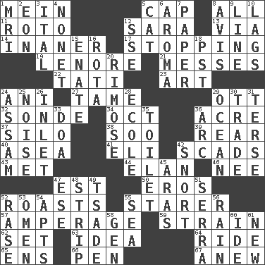 ACROSS 1. Count _ (2 wds.) 5. Head covering 8. Everything 11. Printing process, for short 12. "Two Mules for Sister ____" 13. By way of 14. More empty; more void 17. Obstructing or blocking passage 19. Poe poem 21. Makes clutter 22. Jacques of French films 23. Nonscientific branch of learning 24. Cuckoo 27. Not wild 29. Baseball player Mel 32. Message 34. Sep. follower 36. 43,560 square feet 37. Grain storage tower 38. "Barney Miller" actor Jack 39. Hitchcock's "____ Window" 40. At sea 41. Biblical high priest 42. Tons 43. Was introduced to 44. Enthusiasm 46. Born 47. Eastern Standard Time (abbr.) 50. Greek god of love 52. Cooks with dry heat, as in an oven 55. A viewer who gazes fixedly 57. Electrical Measurement 59. Put through a sieve 62. Arrange properly for use 63. The content of cognition 64. Travel on an animal 65. Followers of ems 66. Writing instrument 67. Afresh DOWN 1. Medical imaging device (abbr.) 2. Age 3. Slanted text style (abbr.) 4. Music written for nine 5. Feline 6. Odor 7. Some stationery 8. Opinion 9. Actor's bit 10. Falls behind 12. Compass dir. 15. Related on the mother's side 16. Round or rotation of duties 18. Pacific Standard Time (abbr.) 20. Full of chinks, cracks, or crevices 24. Indian state 25. Annoying sound 26. An arm off of a larger body of water 28. Learning spot: Fr. 29. Sea 30. Swap 31. Laconic 33. ___ good deed 35. Bathroom 36. Curve 42. Derisive sound 45. Ancient river in northeast Turkey 47. Compass dir. 48. Remove all contents or possession from 49. Sadhe (variant) 51. Spanish missionary in California 52. To erase 53. Sign of things to come 54. Tenement units (abbr.) 55. Ocean 56. Water falling in drops from the sky 58. Commissioned mil. rank 60. Binary compound 61. ___ Haven, CT