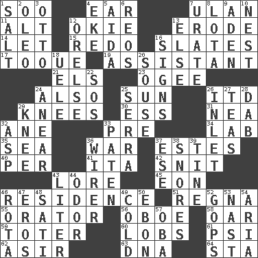 ACROSS 1. "Barney Miller" actor Jack 4. Ewer handle 7. ____ Bator 11. The first octave above the treble staff 12. Migrant worker of the '30s 13. Eat (away) 14. Allow 15. Make new 16. Chalkboards 17. Woman's close-fitting hat 19. Helper 21. Raised railways 23. Double curve, resembling the letter S 24. In addition 25. Player for Phoenix 26. It would 29. Leg joints 30. Double-curved letter 31. Teachers' org. 32. A saturated hydrocarbon 33. Before (prefix) 34. Experiment locale 35. Ocean 36. Armed conflict 37. _____ Park, CO 40. For each 41. Call ___ day 42. In a ____ (agitated or irritated) 43. Old wives' tales, e.g. 45. Age 46. Dwelling 51. Canadian anthropologist Darnell 55. Speaker 56. Mitch Miller's instrument 58. Boat paddle 59. Carrier 60. Tennis shots 61. 23rd letter of the Greek alphabet 62. SW Saudi Arabia district 63. Heredity factor (abbr.) 64. R.R. building DOWN 1. Table seasoning 2. Butter sub 3. "Beetle Bailey" pooch 4. Supplement with great effort 5. Opera by Verdi 6. Vintage cars 7. A salt of uric acid 8. Globular water bottle used in Asia 9. Arabian gulf 10. Egg locale 12. Threatening words 13. Otherwise 16. Attaches a signature 18. Ubangi River tributary 20. Boozer 22. Distress signal 24. Approach 25. Spanish missionary in California 26. An arm off of a larger body of water 27. Beverages made from leaves 28. Pat or tap gently 29. Leg joint 32. Viper 33. Eucharist need 36. One who wires 37. Compass dir. 38. Sounds asleep 39. Prong on a fork 43. 61 cubic inches 44. Scent 46. Roll call or roster of names 47. Greek god of love 48. Suttee (variant) 49. Lacking warmth 50. Inky black, to poets 52. Republicans 53. Political cartoonist Thomas 54. Roberta Peters solo 57. Chief or king in Benin or Nigeria