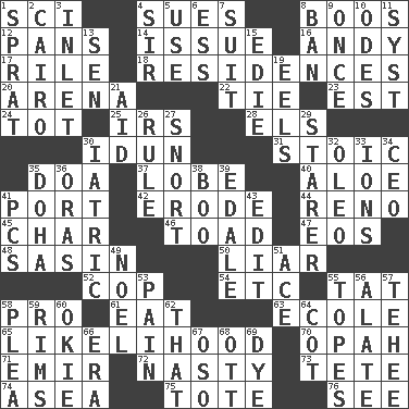 ACROSS 1. _-fi 4. Institutes legal proceedings 8. Scornful sounds 12. Zero-star reviews 14. Come out of 16. Actor Griffith 17. Cause heat under the collar 18. Dwellings 20. Sports stadium 22. Standoff 23. Eastern Standard Time (abbr.) 24. Small child 25. Big collection agency 28. Raised railways 30. Goddess of spring and wife of Bragi 31. Unemotional 35. ___ good deed 37. Ear part 40. Medicinal plant 41. Sweet dark-red dessert wine 42. Wear away 44. Western Nevada city 45. Burn to charcoal 46. Frog relative 47. Greek goddess of the dawn 48. Indian antelope 50. One who doesn't tell the truth 52. Police officer (slang) 54. And so on (abbr.) 55. Make lace 58. Adept person 61. Consume 63. Learning spot: Fr. 65. Probability 70. Brightly colored fish 71. Independent ruler or chieftain 72. Thoroughly unpleasant 73. False hair 74. At sea 75. Carry 76. Observe DOWN 1. Small fatty European fish 2. Capital of Egypt 3. An arm off of a larger body of water 4. Title for a knight 5. Purpose 6. Curvy letter 7. Set of matching outer garments 8. Prohibit 9. At one time in the past 10. Lyric poems 11. System (abbr.) 13. Elected rep. 15. Singer Brickell 19. Snakelike fish 21. Help 26. General guideline 27. Derisive sound 29. A viewer who gazes fixedly 30. Of or pertaining to medicine 32. Margarine 33. Charged particles 34. Corporate head (abbr.) 35. Capital of the state of Qatar 36. Mouths or openings 38. Sometimes accompanies a hiss 39. Peak District village in England 41. Personal Computers (abbr.) 43. Prepare for publication 49. Christmas carol 51. Adept person 53. Ache 55. Drinks excessively 56. Having winglike extensions 57. Giggle 58. Entreaty 59. Basketball hoops 60. Migrant worker of the '30s 62. Not this but _ 64. Small bed 66. Epoch 67. Bear (Spanish) 68. Baseball player Mel 69. Color