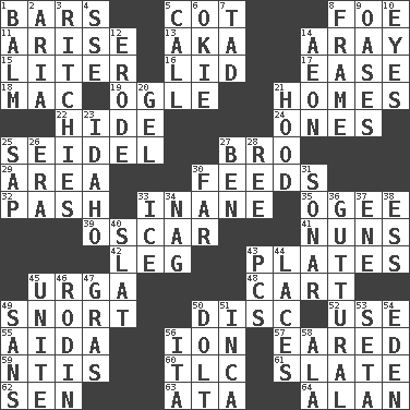 ACROSS 1. Long, evenly shaped pieces 5. Small bed 8. Enemy 11. Ascend 13. Alias (abbr.) 14. Like ___ of sunshine 15. 61 cubic inches 16. Flaplike covering 17. Comfort 18. Big _ 19. Stare at amorously 21. Dwellings 22. Flintstone garb 24. Washington bills 25. Beer mug 27. Sis' sibling 29. Length times width 30. Gives food to 32. Romantic infatuation 33. Empty; void 35. Double curve, resembling the letter S 39. Motion picture award 41. Religious women 42. Part of a journey 43. Food holders 45. Capital and largest city of Mongolia 48. Draw slowly or heavily 49. Derisive sound 50. Flat circle 52. Purpose 55. Opera by Verdi 56. Electrically charged atom 57. Having ears or earlike features 59. Nuclear Threat Initiatives 60. Affectionate concern, for short 61. Schedule 62. Elected rep. 63. "One Day ___ Time" 64. Actor Alda or Thicke DOWN 1. Lip ointment 2. Operatic vocal solo 3. Actors Guy, Robert Welles, and Clint 4. Compass dir. 5. Give a ring to 6. Migrant worker of the '30s 7. Small amount or degree 8. Movie unit 9. Fertile tracts in a desert 10. Sight organs 12. Wear away 14. Age 20. Set 21. Parka part 23. Potato state 25. Plant excrement 26. Period 27. Benjamin's nick name 28. To separate or throw off 30. Distant 31. Echolocation 33. Frozen water 34. Tired old horse 36. From the throat 37. Compass dir. 38. Double-curved letter 40. Narrow board 43. Personal Computers (abbr.) 44. Shoestrings 45. Join together 46. "The Thinker" sculptor 47. Pate de foie ____ 49. Without 50. Dunce 51. South American Indian 53. Stalk of a moss capsule 54. Genesis locale 56. Call ___ day 58. Chicken ___ king