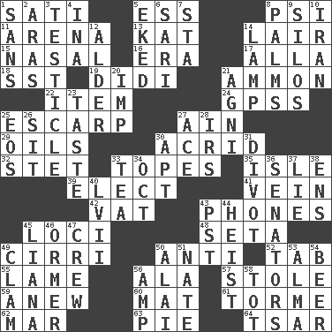 ACROSS 1. Suttee (variant) 5. Curvy letter 8. Air pressure measure (abbr.) 11. Sports stadium 13. Krazy ___ of comics 14. Den 15. Relating to the nose 16. Epoch 17. Silent film actress Nazimova 18. Fast jet (abbr.) 19. "You Light Up My Life" star Conn 21. ID or VA city 22. A distinct part 24. Global Positioning Systems (abbr.) 25. Fortification 27. The 18th letter of the Arabic alphabet 29. Petroleums 30. Sour-tasting 32. Proofreading order 33. Drinks excessively 35. Small island 39. Voters do this 41. Distinctive style or manner 42. Large container 43. Gives a jingle 45. Event scenes 48. Bristle 49. High-altitude cloud 50. Opposed to 52. Keyboard key 55. Unable to walk 56. In the manner of 57. Took without asking 59. Afresh 60. Floor protector 61. Singer Mel 62. Impair 63. Sliced dessert 64. Russian ruler of old DOWN 1. Without 2. Caspian sea tributary 3. One of the two male reproductive glands 4. _ tizzy (2 wds.) 5. Made supply last 6. Indian skirt 7. R.R. building 8. Insides of hands 9. Grain storage towers 10. SW Asia republic 12. Tree or shrub in the Birch family 14. Desk light 20. Naughty child 21. Hindu god of fire 23. Clothes sense 25. Greek goddess of the dawn 26. Be seated 27. Adept person 28. Big collection agency 30. Fitting 31. A piece of turf (Scot.) 33. Afternoon social gathering 34. Sep. follower 36. Legislators 37. Falsehood 38. Followers of ems 40. 57 in ancient Rome 43. Pacific Standard Time (abbr.) 44. Robbery 45. Climbing, woody, usually tropical vines 46. Abalone 47. Ship's personnel 49. Burrowing marine mollusk 50. Jai ____ 51. Nathan's nickname 53. _ mater 54. Fermented drink made from hops 56. Electrical Unit 58. Small child