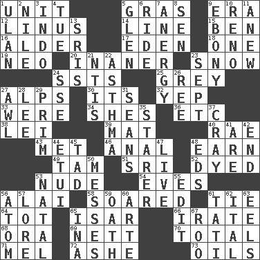 ACROSS 1. A single undivided whole 5. Pate de foie ____ 9. Period 12. "_ and Lucy" (Charlie Brown theme song) 14. Actor's bit 15. Benjamin's nick name 16. Tree or shrub in the Birch family 17. Paradise 18. Single 19. Modern: prefix 20. More lacking in sense or substance 23. Overwhelm 24. Fast planes 25. Jennifer or Joel 27. High mountains 30. It is 32. Slangy assent 33. Past tense of be (plural) 34. "______ My Girl" (Turtles hit) 36. And so on (abbr.) 38. Flowery wreath 39. Floor covering 40. Actress Charlotte 43. Was introduced to 46. Of or related to the anus 48. Merit 49. Scottish cap 51. Indian title of respect (Mr.) 52. Colored 53. Unadorned 54. Nights before holidays 56. Jai ____ 58. Flew 61. Standoff 64. Small child 65. Austrian river, tributary to the Danube 66. Feeling or showing extreme anger 68. Mouth or opening 69. Remaining after all deductions 70. Add up to 71. Cartoonist voice _ Blanc 72. American tennis player Robert 73. Lubricates DOWN 1. ____ Bator 2. The longest river in the world 3. Southeast Asian peninsula 4. Third day of the wk. 5. Small, secluded valley 6. Travel on or in a vehicle 7. Disorder of the immune system 8. Elected rep. 9. Black 10. Former U.S. Attorney General Janet 11. Afresh 13. Indian titles of respect 21. Nuclear Threat Initiatives 22. Respiratory problem 23. Back-to-school mo. 24. Compass dir. 26. To sift 27. Leather borer 28. Area sheltered from the wind 29. Demure 31. Actors Connery and Penn 35. A viewer who gazes fixedly 37. Supercomputer manufacturer 41. "We ___ not amused" (Victoria) 42. Conclude 44. Needle holder 45. Small amount or degree 47. Not recorded 48. Begley and Asner 50. Makes clutter 53. Relating to or accompanying birth 55. Prepare for publication 56. Tiny particle 57. Old wives' tales, e.g. 59. Pledge 60. Johnson of "Laugh-In" 61. Jacques of French films 62. Slanted text style (abbr.) 63. Snakelike fish 65. _ tizzy (2 wds.) 67. Friend of Pooh
