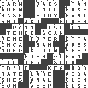 ACROSS 1. Merit 5. Raised platform 9. Scottish cap 12. An important port of Yemen 13. International (abbr.) 14. Celtic language 15. To erase 16. Whirlpool 17. 90 degrees 18. _ Lanka 19. Find the sum of 21. A person who is older than you are 22. American folk hero Crockett 24. Frozen water 26. Compass dir. 27. Giggle 28. Skim 29. French philosopher Descartes 30. Drug addict 32. Singer James 36. South American Indian 37. Prohibit 38. Ancient Greek god of war 39. Wrote a lyric poem 40. Japanese brewing company 42. Ooze 43. Sliced desserts 44. Sea 46. Standoff 49. Big collection agency 50. Disposed of to a purchaser 51. Peak District village in England 53. Barrel 54. Disorderly crowd 57. Pace 58. Have the gumption 61. Opera by Verdi 62. "______ My Girl" (Turtles hit) 63. Of or related to the anus 64. Small, secluded valley 65. A really long time 66. Shed a tear 67. Otherwise DOWN 1. Hearing organs 2. The sixth month of the Jewish calendar 3. Home 4. Compass dir. 5. Passed on 6. Plus 7. It would 8. Stealthy 9. Buy and sell 10. NE Netherlands city 11. Distance measurement (Brit.) 14. Snakelike fish 19. "___ Maria" 20. Colored 21. Car or cant ending 23. At or in the front 24. Ancient Celtic tribe of eastern Britain 25. 4-wheeled motor vehicle 27. Be inclined (to) 28. Practice fights 29. River (Sp.) 31. Off-Broadway awards 32. Artist's stand 33. Excercise machine 34. Adolescent 35. Cleo's killer 40. Apertif with cassis 41. Sense of smell 43. Sliced dessert 45. Gear tooth 46. Laconic 47. Potato state 48. Eroded 52. French article 53. Seaweed 55. Lyric poems 56. Object of repulsion 58. Obsolete 59. One (Scot) 60. Actress Charlotte 61. Mature