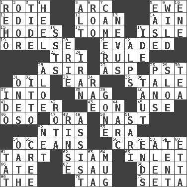 ACROSS 1. Writer of Portnoy's Complaint (1969) 5. Curve 8. She-sheep 11. Singer Brickell 12. Grant temporary use of 14. The 18th letter of the Arabic alphabet 15. Methods 17. Heavy book 18. Small island 19. Threatening words 21. Dodged 23. Three (prefix) 25. Court order 26. SW Saudi Arabia district 27. Cleo's killer 28. Pacific Standard Time (abbr.) 31. Petroleum 33. Ewer handle 35. Lacking originality or spontaneity 37. To the inside or interior of 38. Tired old horse 40. Small Philippine buffalo 41. Prevent from occurring 43. Period of immesurable duration 45. Purpose 46. Bear (Spanish) 47. Mouth or opening 50. Political cartoonist Thomas 52. Nuclear Threat Initiatives 53. Period 54. Seas 56. Cause to be 61. Small pie 62. Thailand, formerly 65. An arm off of a larger body of water 66. Had dinner 67. He sold his birthright 68. Scratch 69. Definite Article 70. Label 71. Bristle DOWN 1. San ____ (Riviera town) 2. Scent 3. Event that recurs at intervals 4. The bottom of a shoe or boot 5. The first octave above the treble staff 6. Friend of Pooh 7. Device for capturing images 8. Relaxation 9. Rampant 10. Compass dir. 13. Congenital growth or mark on the skin 16. Fast planes 18. Binary compound 20. One of the Great Lakes 22. High mountains 24. SW Asia republic 26. _ vera 28. Zero-star reviews 29. A type of plum 30. Beverage made from leaves 31. Singles 32. "Tell ____ the Marines!" 34. Actress Charlotte 36. Drawn tight 37. Wedding promise 39. Went 42. Round or rotation of duties 44. Drug cop 48. Remove soap 49. Help 51. Indian skirt 52. Fish or hair follower 54. Pledge 55. Algonquian 57. Conclusions 58. Toward shelter 59. Portable shelter 60. Singer James 61. Make lace 63. Auto club (abbr.) 64. Java container