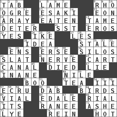 ACROSS 1. Bar bill 4. Unable to walk 8. 17th letter of the Greek alphabet 11. Legendary monster 13. 1973 Nobel Price Winner (Physics) Leo 15. Age 16. Like ___ of sunshine 17. Consumed 18. Not wild 19. Prevent from occurring 21. Fast jet (abbr.) 22. Greek god of love 23. It is so 24. Eisenhower's nickname 27. French article 29. It may be bright or harebrained 30. Having lost freshness 34. Followers of ems 36. Celtic language 39. Grain storage towers 40. Narrow board 41. Effrontery 43. Draw slowly or heavily 44. Lessep's creation 46. Passed on 47. Untruth 48. Empty; void 49. "Death on the ____" 51. Oct. 31 cry 53. Afternoon social gathering 54. One more than two 57. Shade of tan 60. Pat or tap gently 63. Avian creatures 65. Small bottle 66. Peak District village in England 69. Monetary unit of Yemen 70. ___ a Wonderful Life 71. The wife of a rajah (variant) 72. American tennis player Robert 73. Potassium hydroxide 74. It's straight from the horse's mouth 75. Being at a high temperature DOWN 1. Sycophant 2. Match 3. Naughty children 4. Area sheltered from the wind 5. White ___ sheet 6. Floor protectors 7. Makes supply last 8. Posterior 9. Like (prefix) 10. Singles 12. Sight organ 14. International (abbr.) 18. A testis 20. To free from 25. Peachy ____! 26. Having ears or earlike features 28. Double-curved letter 29. Byzantium, centuries later 31. Jai ____ 32. Old wives' tales, e.g. 33. Eastern Standard Time (abbr.) 34. Enthusiasm 35. Nanny 37. _ Lanka 38. Incident 40. _-fi 42. Singer Brickell 45. Lion 50. Experiment locale 52. River in Europe 54. From or relating to Ireland 55. Potato state 56. Small island 57. Tending to cause great harm 58. Municipality 59. To erase 61. The sixth month of the Jewish calendar 62. Object of repulsion 64. Lyricist Gershwin 67. Flowery wreath 68. Car or cant ending
