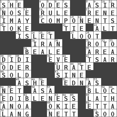 ACROSS 1. A female animal or person 4. Lyric poems 8. SW Saudi Arabia district 12. Olfactory organ 14. Court order 15. French philosopher Descartes 16. "If ____ say so..." 17. Pieces 20. Puff or smoke 21. Neckwear 22. Keyboard modifier key 23. Small island 27. Plunder 29. SW Asia republic 31. Printing process, for short 34. Memphis, Tenn. Street 35. Length times width 36. "You Light Up My Life" star Conn 39. Night before a holiday 41. Russian ruler of old 42. River in Europe 43. A salt of uric acid 46. Exchanged or delivered for money 47. Trig term 48. American tennis player Robert 51. Ferber et al. 54. Fish or hair follower 56. White ___ sheet 58. Alliance 61. The property of being fit to eat 66. Thin strip of wood or metal 67. Small Philippine buffalo 68. Migrant worker of the '30s 69. Singer James 70. Long (Scottish) 71. Remaining after all deductions 72. "Barney Miller" actor Jack DOWN 1. In a ____ (agitated or irritated) 2. Like (prefix) 3. 1973 Nobel Price Winner (Physics) Leo 4. The grampus (Milton) 5. Superhero pair 6. Shade tree 7. Back-to-school mo. 8. "We ___ not amused" (Victoria) 9. Elected representatives 10. International (abbr.) 11. Relief 13. Snake ____ (dice throw) 18. Lubricate 19. Modern: prefix 24. Untruth 25. Period 26. Story 28. Declaim 30. Congenital growth or mark on the skin 32. Beverage made from leaves 33. Rowing implement 34. Avian creatures 36. Two (Sp.) 37. Wedding promise 38. Conveyance 40. One of the Great Lakes 44. Added to 45. Nine, plus one 49. Actor Linden 50. Compass dir. 52. Competent 53. Narrow boards 54. Anneal 55. Pulitzer Prize-winning author Ferber 57. At once, immediately (arch.) 59. "Beetle Bailey" pooch 60. US Secretary of Labor Elaine L. _ 62. Container for groceries 63. Make supply last 64. Be seated 65. Arrange properly for use