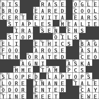 ACROSS 1. Altar cloth linen 4. Raze (variant) 8. Stare 12. Sis' sibling 13. Having ears or earlike features 14. Calm and collected 15. An absolute certainty 17. Webber/Rice musical 18. Hearing organs 19. Paper fasteners 21. Ear of corn 23. Retirement account (abbr.) 24. Elected rep. 26. Followers of ems 27. Discontinue 28. Petroleums 30. Connecticut Ivy Leaguer 31. Value system 34. Container for groceries 37. Egg _ yung 38. Came up 39. White ___ sheet 40. Nine, plus one 41. Spoke pompously 42. Corporate head (abbr.) 43. Hindu god of fire 44. "____ silly question..." 46. Madame (abbr.) 47. Scottish cap 50. Personal Computers (abbr.) 51. Had an oblique or slanted direction 54. Portable computers 57. Old wives' tales, e.g. 58. Lacking in sense or substance 60. Falsehood 62. Aroma 63. Keyboard key 64. Island 65. Prong on a fork 66. Confront 67. She-sheep DOWN 1. English channel? 2. Angers 3. Conclusion 4. All-night dance parties 5. Ascend 6. Arrange properly for use 7. Dutch treat 8. Seas 9. Scores awarded for successful feats 10. Australian parrot (variant) 11. Otherwise 13. Snakelike fish 16. Edible starchy tuberous root 20. Infant food 22. Snakelike fish 25. Annoying sound 27. A type of plum 29. On the rocks 30. Lizard (obsolete) 31. Merit 32. Distinguishing feature 33. Being at a high temperature 34. Keyboard key 35. At sea 36. E Mali city 41. Double curve, resembling the letter S 43. Electrical Unit 44. Fitting 45. Native of Scotland 46. Person of subnormal intelligence 48. Having winglike extensions 49. French painter Edouard 51. Position in a hierarchy or organization 52. Farming town in central California 53. South Vietnam president (1954) 55. For each 56. Cole _ (cabbage dish) 59. Compass dir. 61. Sight organ
