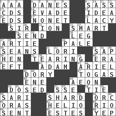 ACROSS 1. American Automobile Association (abbr.) 4. Natives or inhabitants of Denmark 9. Backtalk 13. Music discs 14. Elude 15. The main thing one is thinking about 16. Begley and Asner 17. Music written for nine 18. Made of lace 19. Title for a knight 21. Electrically charged atom 22. Don Adams' spy role 24. Transmit 26. Part of a journey 27. Nick name for Arthur 29. Light colored 30. Actors Connery and Penn 31. Australian parrot (variant) 33. Plant excrement 36. Layer 37. Pulling into pieces 40. Epoch 41. Lizard (obsolete) 42. First of billions? 43. Satellite of Uranus 45. Small, narrow, flatbottom fishing boat 47. Ancient Roman robes 48. Compass dir. 49. A really long time 50. Administered medicine 52. Compass dir. 54. Standoff 56. Indian skirt 57. Broken piece 59. The grampus (Milton) 61. Mouths or openings 62. Sun: prefix 63. River (Sp.) 64. Emitted 65. _____ Park, CO 66. Slangy assent DOWN 1. Adept person 2. Sums up 3. Helper 4. Lair 5. Shun 6. Billionth: prefix 7. Genesis locale 8. Put into a specified state 9. Fodder prepared in a silo 10. The sixth month of the Jewish calendar 11. Religious group 12. Declare 20. It's straight from the horse's mouth 22. Killed 23. Cartoonist voice _ Blanc 25. Egg locale 27. American tennis player Robert 28. Coral ridge 29. Demure 31. Kenny Rogers chart-topper in '80 32. Mouth or opening 33. Signiory (variant) 34. Type of rug 35. Friends 38. Having ears or earlike features 39. Yard entry 44. Carrot, for example 45. Cease 46. Single 49. Nest on high 50. Have the gumption 51. NW Algerian seaport 52. "______ My Girl" (Turtles hit) 53. Table seasoning 55. 4th largest of the Great Lakes 56. Mayday 57. A female animal or person 58. Two (Sp.) 60. Police officer (slang)