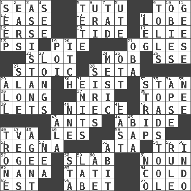ACROSS 1. Oceans 5. Ballerina skirt 9. Coat; cloak 12. Relaxation 13. Part of Q.E.F. 14. Ear part 15. Celtic language 16. Event that recurs at intervals 17. Writer Wiesel 18. 23rd letter of the Greek alphabet 19. Sliced dessert 21. Stares 22. Notch 24. Disorderly crowd 26. Compass dir. 27. Unemotional 28. Bristle 29. Actor Alda or Thicke 30. Robbery 32. Comedian Laurel of Laurel & Hardy 36. Protracted 37. Medical imaging device (abbr.) 38. Drink excessively 39. Allows 40. Sibling's daughter 42. To erase 43. Pismires 44. Remain 46. Federal power corp. 49. French article 50. Plant excrements 51. Rain (Swedish) 53. _ moment's notice (2 wds.) 54. Three (prefix) 57. Double curve, resembling the letter S 58. Thick slice 61. Part of speech 62. Grandmother 63. Jacques of French films 64. Lacking warmth 65. Eastern Standard Time (abbr.) 66. Collude with 67. Butter sub DOWN 1. Ooze 2. Hearing organs 3. Aide 4. Observe 5. Wig 6. RI univ. 7. Small boy 8. Shoshoni 9. For Whom the Bell _____ 10. Off-Broadway awards 11. Honkers 14. Part of a journey 19. Luau course 20. Hankering 21. Chief or king in Benin or Nigeria 23. Yearns 24. Of or pertaining to a meson 25. Baseball player Mel 27. A type of plum 28. Titles for men of rank and authority 29. Everything 31. Sends forth 32. Long narrow piece of something 33. Inedible or poisonous agaric 34. Domed church section 35. Born 40. Compass dir. 41. 90 degrees 43. According to 45. Sound made by sheep 46. Heavy duty weighing machine 47. Viva Las _ 48. Representative 52. Teachers' org. 53. "This won't hurt ____!" 55. Court order 56. _ china 58. R.R. building 59. Experiment locale 60. Had dinner 61. Non-commissioned officer (abbr.)