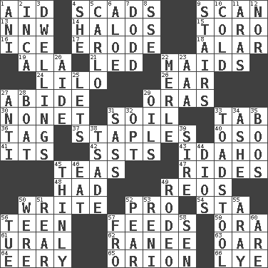 ACROSS 1. Help 4. Loads 9. Glance over 13. Compass dir. 14. Saint headwear 15. "Corrida" creature 16. Frozen water 17. Eat (away) 18. Having or resembling wings 19. In the manner of 21. Directed 22. Unmarried girls 24. _ and Stitch 26. Hearing organ 27. Tolerate 29. Mouths or openings 30. Music written for nine 31. Earth 33. Keyboard key 36. Label 37. Paper fasteners 40. Bear (Spanish) 41. It is 42. Fast planes 43. Potato state 45. Beverages made from leaves 47. Amusement-park features 48. Possessed 49. Vintage cars 50. Compose 52. Adept person 54. R.R. building 56. Adolescent 57. Gives food to 59. Mouth or opening 61. Mountain range 62. The wife of a rajah (variant) 63. Boat paddle 64. Suggestive of the supernatural 65. Constellation of myth 66. Sodium hydroxide DOWN 1. Cuckoo 2. South American Indian 3. Homes 4. A female animal or person 5. Monte _, Las Vegas Hotel/Casino 6. Medicinal plant 7. Texas town _ City 8. Compass dir. 9. Flight of steps 10. Lacking warmth 11. Ancient river in northeast Turkey 12. Or not 20. Assistant 22. Haggard of country music 23. Auto club (abbr.) 25. Allows 27. Against 28. Water vessel 29. Petroleums 31. Backtalk 32. Elect 33. Inedible or poisonous agaric 34. American tennis player Robert 35. Expressions of contempt or scorn 38. Sadhe (variant) 39. The founder of a family 44. "Vaya con ____" 45. Without viscosity 46. Ingest 49. Cowboy competition 50. Past tense of be (plural) 51. Posterior 52. Lightbulb-shaped fruit 53. Painter Guido (1575-1642) 55. Like ___ of sunshine 56. Third day of the wk. 57. Away 58. Elected rep. 60. "We ___ not amused" (Victoria)