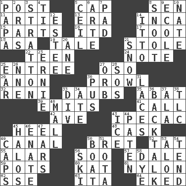 ACROSS 1. Mail 5. Head covering 8. Elected rep. 11. Nick name for Arthur 13. Period 14. South American Indian 15. Components 16. It would 17. A blast of a horn 18. White ___ sheet 19. Lie 21. Fur scarf 22. Adolescent 24. Musical sound 25. Main course 27. Bear (Spanish) 29. At once, immediately (arch.) 30. Move like a hungry wolf 32. Painter Guido (1575-1642) 33. Applies to a surface 35. Blind as ____ 39. Gives off 41. Give a ring to 42. "___ Maria" 43. Medicinal drug used to evoke vomiting 45. Person who is morally reprehensible 48. Keg 49. Lessep's creation 50. Cy Young winner Saberhagen 52. Make lace 55. Having or resembling wings 56. "Barney Miller" actor Jack 57. Peak District village in England 59. Cooking vessels 60. Krazy ___ of comics 61. High-strength synthetic material 62. Compass dir. 63. Call ___ day 64. Supplemented with great effort DOWN 1. Dad 2. Mouths or openings 3. Ski resort town in Vermont 4. Teat (slang) 5. To provide with a ceiling 6. Johnson of "Laugh-In" 7. Groovy apt. 8. Snob 9. Learning spot: Fr. 10. Nathan's nickname 12. First name in cosmetics 14. "Tell ____ the Marines!" 20. A saturated hydrocarbon 21. Overwhelm 23. Bert's buddy 25. Hearing organ 26. Compass dir. 27. Globe 28. Distress signal 30. Tenth month of the Hindu calendar 31. Shoestrings 33. HTML Container Element 34. Had dinner 36. Sass 37. Wing 38. Affectionate concern, for short 40. Promenade 43. Frozen water 44. Eucharist need 45. Saint headwear 46. Related on the mother's side 47. Hearing organs 49. Smile enhancers 50. Water vessel 51. Roll call or roster of names 53. Medicinal plant 54. Be inclined (to) 56. What Jean-Claude Killy likes to do 58. Color