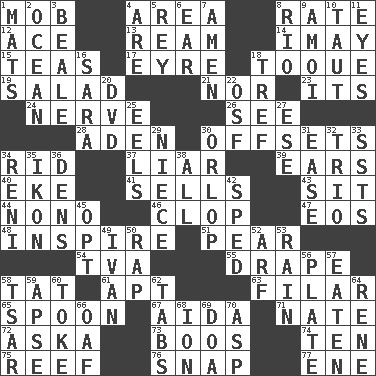 ACROSS 1. Crowd into 4. Length times width 8. Assign a rank or rating to 12. Adept person 13. 480, 500 or 516 sheets of paper 14. "If ____ say so..." 15. Afternoon social gatherings 17. Jane of fiction 18. Woman's close-fitting hat 19. Vegetable dish 21. Or not 23. It is 24. Impudent aggressiveness 26. Observe 28. An important port of Yemen 30. Compensates for 34. To free from 37. One who doesn't tell the truth 39. Hearing organs 40. Supplement with great effort 41. Makes a sale 43. Be seated 44. Words to Nanette 46. Hoof sound 47. Greek goddess of the dawn 48. Motivate 51. Lightbulb-shaped fruit 54. Federal power corp. 55. Window treatment 58. Make lace 61. Fitting 63. Having threads 65. Soup utensil 67. Opera by Verdi 71. Nathan's nickname 72. "____ silly question..." 73. Expressions of contempt or scorn 74. Nine, plus one 75. Coral collection 76. Fastener 77. Compass dir. DOWN 1. Floor coverings 2. Sea 3. Calif. Air Force Base 4. "We ___ not amused" (Victoria) 5. Marina Del _, California 6. Ewer handle 7. So be it 8. _ de Janeiro 9. Mine, in Marseilles 10. Pulled tight 11. Sight organs 16. "Two Mules for Sister ____" 18. Not kosher 20. Movie disc 22. Order of Saint Francis (abbr.) 25. Snakelike fish 27. Compass dir. 29. Sibling's daughter 30. Lowest deck of a ship 31. Relaxation 32. Musical group of three 33. Fast planes 34. Painter Guido (1575-1642) 35. Picture 36. Cub Scout units 38. 100% 42. Hurried 45. Choose 49. _ the terrible 50. Hit sharply and swiftly 52. Sandy's bark 53. Water falling in drops from the sky 56. Food holder 57. Consumed 58. Russian ruler of old 59. Domed church section 60. Casino tip 62. Bar bills 64. French philosopher Descartes 66. Clumsy lout 68. Electrically charged atom 69. ___ good deed 70. Viper