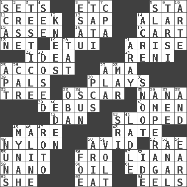 ACROSS 1. Arranges properly for use 5. And so on (abbr.) 8. R.R. building 11. Small stream 13. Plant excrement 14. Having or resembling wings 15. NE Netherlands city 16. "One Day ___ Time" 17. Heavy open wagon 18. Fish or hair follower 19. Needle holder 21. Originate 22. The main thing one is thinking about 24. Painter Guido (1575-1642) 25. Buttonhole 27. Nursemaid (var.) 29. Friends 30. Romps 32. Woody plant 33. Motion picture award 35. Grandmother 39. To get out of a bus 41. Sign of things to come 42. Daniel's nick name 43. Inclined 45. Female horse 48. Pace 49. High-strength synthetic material 50. Enthusiastic 52. Actress Charlotte 55. A single undivided whole 56. Back 57. Climbing, woody, usually tropical vines 59. Billionth: prefix 60. Petroleum 61. _ Allan Poe 62. A female animal or person 63. Consume 64. Snakelike fish DOWN 1. Skim 2. Celtic language 3. One of the two male reproductive glands 4. Observe 5. He sold his birthright 6. Jacques of French films 7. Tax preparer (abbr.) 8. Killed 9. Tarsus (plural) 10. Johnson of "Laugh-In" 12. Leg joints 14. Land measure 20. Make lace 21. Like ___ of sunshine 23. Administered medicine 25. Fitting 26. Automobile 27. In the manner of 28. Third mo. 30. Personal Computers (abbr.) 31. Snob 33. Chief or king in Benin or Nigeria 34. Player for Phoenix 36. Electrical Measurement 37. Born 38. Also 40. Paradise 43. Indian title of respect (Mr.) 44. Dipping utensil 45. Non-adult bird? 46. Place in a line 47. Printing process, for short 49. Religious women 50. Operatic vocal solo 51. Electrical Unit 53. Of or related to the anus 54. Hearing organs 56. Enemy 58. Binary compound