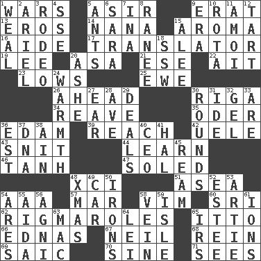 ACROSS 1. Armed conflicts 5. SW Saudi Arabia district 9. Part of Q.E.F. 13. Greek god of love 14. Grandmother 15. Scent 16. Helper 17. Interpreter 19. Area sheltered from the wind 20. White ___ sheet 21. Compass dir. 22. Small island 23. Moos 25. She-sheep 26. Toward the future 30. Port city in Latvia 34. Break or tear apart 35. River in Europe 36. Dutch treat 39. Arrive at 42. Ubangi River tributary 43. In a ____ (agitated or irritated) 44. Acquire or gain knowledge or skills 46. Hyperbolic tangent 47. Having a sole or soles 48. One more than ninety 51. At sea 54. Auto club (abbr.) 57. Third mo. 58. Zeal 60. Indian title of respect (Mr.) 62. Complicated, petty procedures 65. "Tell ____ the Marines!" 66. Ferber et al. 67. Famous astronaut Armstrong 68. It's straight from the horse's mouth 69. Ketch in the Levant 70. Trig term 71. Observes DOWN 1. Welt 2. Satellite of Uranus 3. Cowboy competition 4. Compass dir. 5. Pismires 6. "Two Mules for Sister ____" 7. _ tizzy (2 wds.) 8. The wife of a rajah (variant) 9. Period 10. Round or rotation of duties 11. Mine, in Marseilles 12. Small pie 15. Toward shelter 18. Compass dir. 20. American tennis player Robert 24. Heat 27. Ewer handle 28. "___ Maria" 29. Allots cards 30. Periods in a boxing match 31. Binary compound 32. Set 33. "We ___ not amused" (Victoria) 36. Eastern Standard Time (abbr.) 37. Heredity factor (abbr.) 38. The 18th letter of the Arabic alphabet 40. Corporate head (abbr.) 41. Actor Linden 45. 480, 500 or 516 sheets of paper 48. Dec. holiday 49. 4-wheeled motor vehicle 50. Removes the wrinkles 52. First name in cosmetics 53. Nick name for Arthur 54. Ancient Greek god of war 55. Opera by Verdi 56. Hindu god of fire 58. Distinctive style or manner 59. Capri or Wright 61. Charged atoms 63. Big _ 64. Flowery wreath 65. Big collection agency