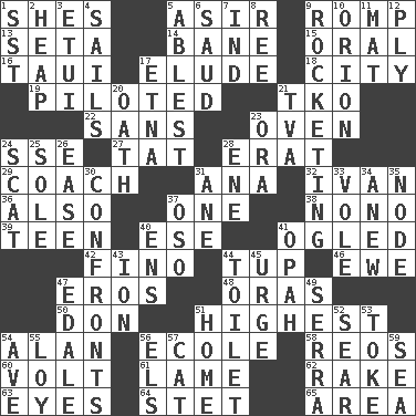 ACROSS 1. "______ My Girl" (Turtles hit) 5. SW Saudi Arabia district 9. Frolic 13. Bristle 14. Object of repulsion 15. Of the mouth 16. "Change" in Tahitian 17. Dodge 18. Municipality 19. Manned the helm 21. Ring climax 22. Without 23. Baking chamber 24. Compass dir. 27. Make lace 28. Part of Q.E.F. 29. Team commander 31. Santa ___, CA 32. _ the terrible 36. In addition 37. Single 38. Words to Nanette 39. Adolescent 40. Compass dir. 41. Stared 42. A pale, very dry sherry 44. Uncastrated adult male sheep 46. She-sheep 47. Greek god of love 48. Mouths or openings 50. Spanish title 51. Having the greatest elevation 54. Actor Alda or Thicke 56. Learning spot: Fr. 58. Vintage cars 60. Electrical Unit 61. Unable to walk 62. Libertine 63. Sight organs 64. Proofreading order 65. Length times width DOWN 1. Fast jet (abbr.) 2. Pile 3. Needle case 4. Moves on water 5. Most capable 6. Saudi Arabian king (1953-1964) 7. Working for oneself (abbr.) 8. To riddle 9. Shooting up abruptly 10. Constellation of myth 11. Floor covering 12. Strand of rope, yarn or thread 17. Inactive volcano in Sicily 20. Pledge 21. Federal power corp. 23. Mouth or opening 24. Leave at once 25. Not divided or shared with others 26. Comfort 28. Compass dir. 30. Meets 31. A saturated hydrocarbon 33. Grand slam 34. Afresh 35. Thickened enlargement 37. Bear (Spanish) 40. Followers of ems 41. Brightly colored fish 43. Electrically charged atom 44. Bathroom plumbing fixture 45. Goad 47. Peak District village in England 49. Father Junipero _ 51. Dwelling 52. Burn superficially 53. Puff or smoke 54. "___ Maria" 55. Myrna of the movies 56. Raised railways 57. Feline 59. Ocean
