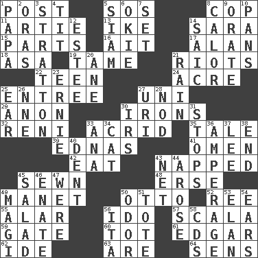 ACROSS 1. Mail 5. Mayday 8. Police officer (slang) 11. Nick name for Arthur 13. Mamie's husband 14. "Two Mules for Sister ____" 15. Components 16. Small island 17. Actor Alda or Thicke 18. White ___ sheet 19. Not wild 21. Debaucheries 22. Adolescent 24. Land measure 25. Main course 27. Corn or form start 29. At once, immediately (arch.) 30. Removes the wrinkles 32. Painter Guido (1575-1642) 33. Bitter 35. Lie 39. Ferber et al. 41. Sign of something about to happen 42. Ingest 43. Slept 45. Stitched 48. Celtic language 49. French painter Edouard 50. Von Bismarck 52. To separate or throw off 55. Having or resembling wings 56. Wedding promise 57. Any of the three canals of the cochlea 59. Yard entry 60. Small child 61. _ Allan Poe 62. Binary compound 63. "We ___ not amused" (Victoria) 64. Elected reps. DOWN 1. Dad 2. Mouths or openings 3. Ski resort town in Vermont 4. Teat (slang) 5. Thailand, formerly 6. Migrant worker of the '30s 7. Arrange properly for use 8. Bodily heat indicating an inflammation 9. Declaim 10. Zero-star reviews 12. First name in cosmetics 14. Ketch in the Levant 20. One (Scot) 21. Precipitation 23. Bert's buddy 25. Ewer handle 26. Compass dir. 27. RI univ. 28. Allow head to fall sleepily 30. Big collection agency 31. Ceases 33. Santa ___, CA 34. Feline 36. Electrical Measurement 37. Area sheltered from the wind 38. Conclude 40. Incision 43. Fish or hair follower 44. Came up 45. First course 46. Maternal 47. We are 49. Wise men 50. Aroma 51. Lug 53. Flair 54. Hearing organs 56. Call ___ day 58. Music discs